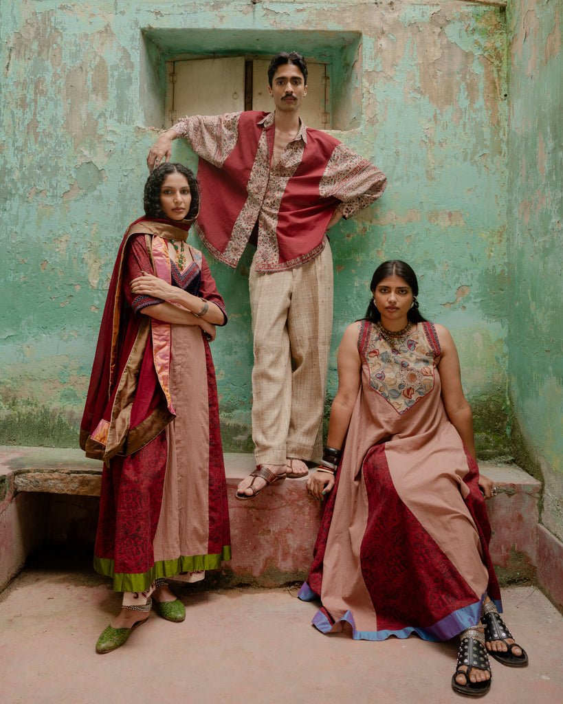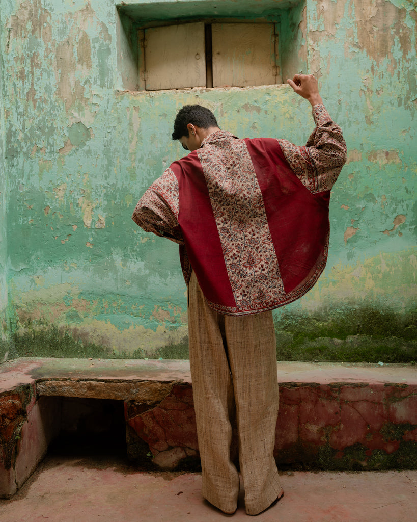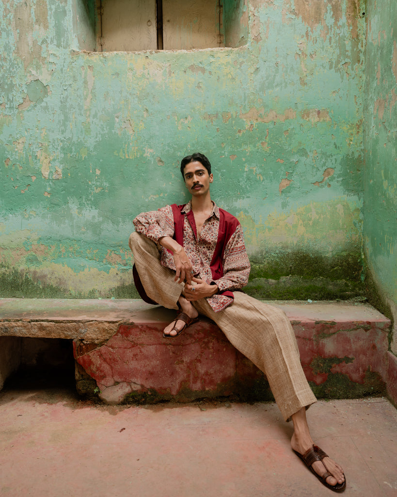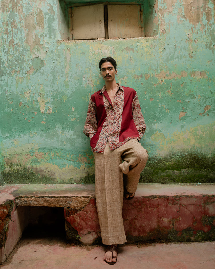 A relaxed silhouette in earthy beige and maroon, crafted in soft Mangalgiri cotton with intricate block printed panels blending artisinal detail with effortless contemporary style