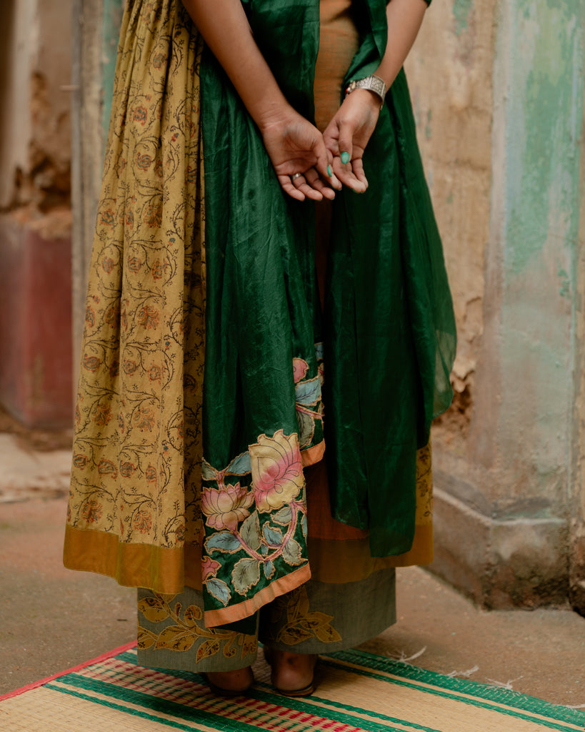 A regal ensemble featuring a deep green velvet bodice paired with a mustard block printed overlay.