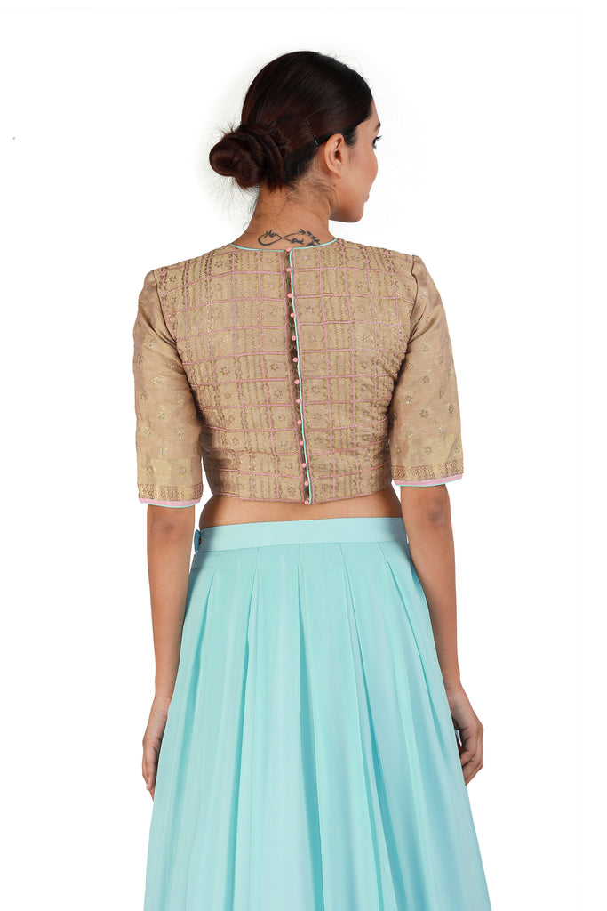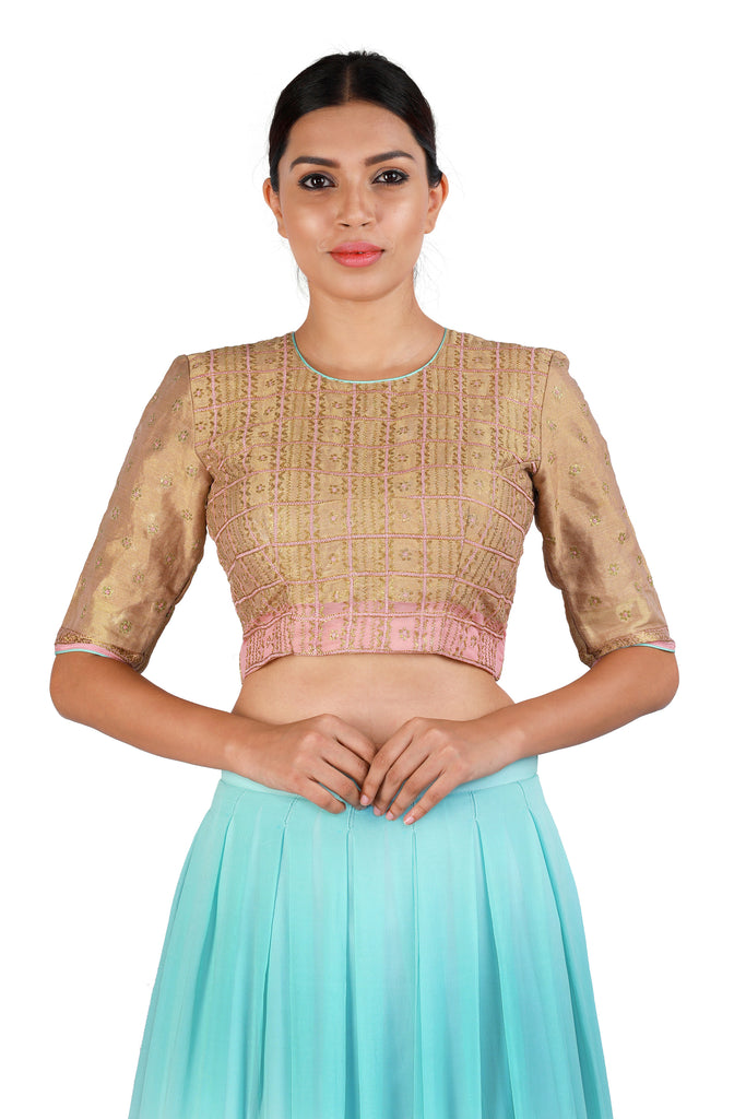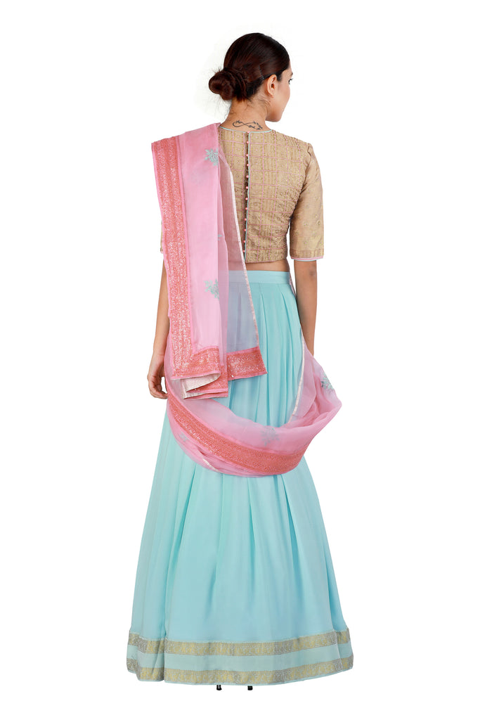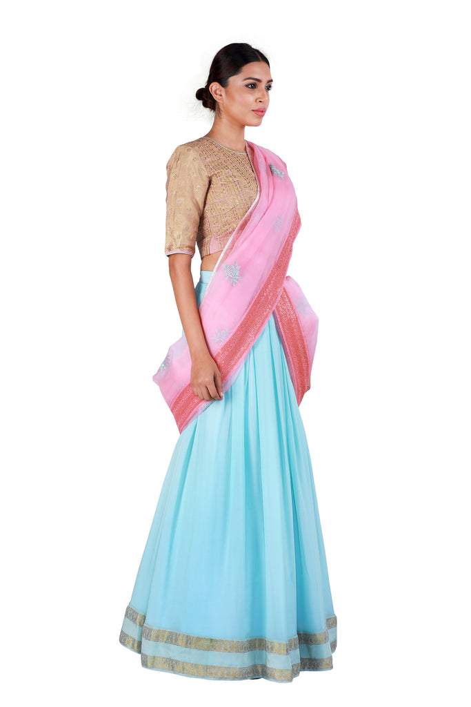 Bring out your feminine side with this powder blue lehenga in gorgeous georgette paired with a contrasting and intricately embroidered gold blouse. Finish off the soft and sophisticated look by draping a pink organza dupatta with a complementing border.