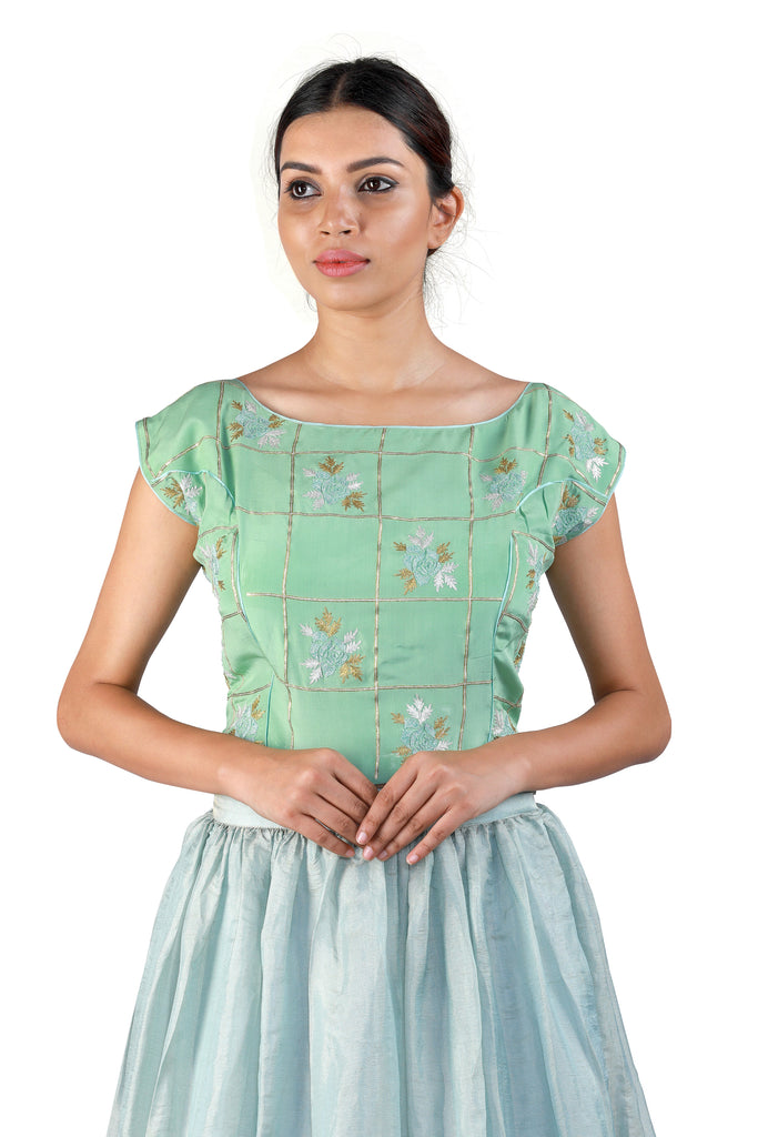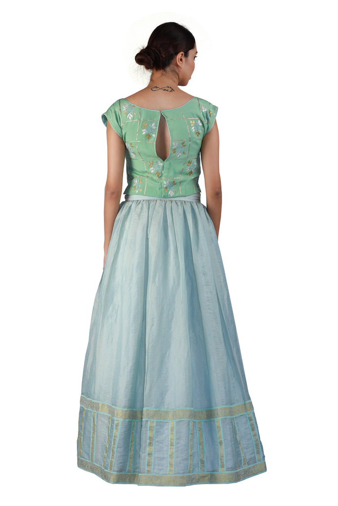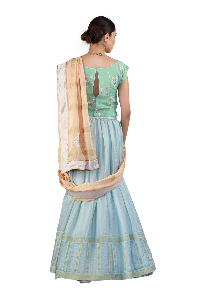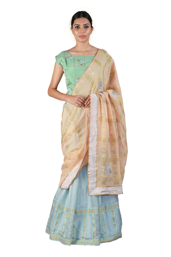 Look pretty, playful, and ethereal in this blue tissue lehenga with a green keyhole-cut silk blouse accented beautifully with hand embroidery. Complete the look with a subtle and elegant peach dupatta in georgette with a contrast checkered pattern.