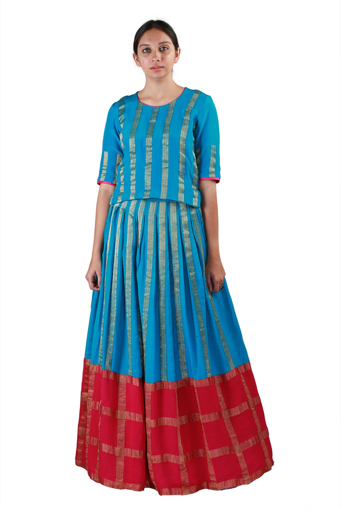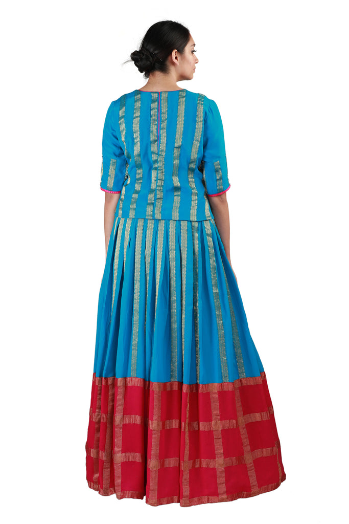 Ring in the festive season in style with this gorgeous langa adorned with woven borders in its blue crepe blouse, blue georgette skirt with a pink bottom in gold checks, as well as a flowy blue georgette dupatta.