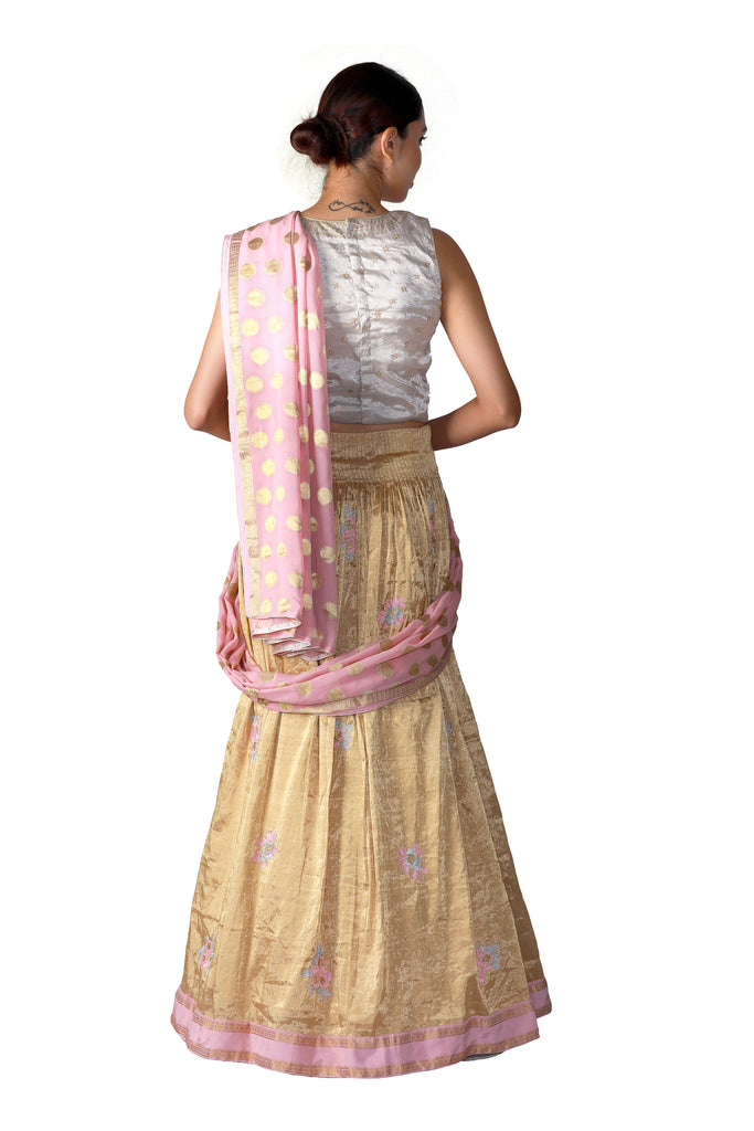 Bring out your feminine side with this gold tissue lehenga with roses embroidered on it, paired with a silver sleeveless blouse in tissue. Finish off the soft and sophisticated look with a pink georgette dupatta with gold motifs.