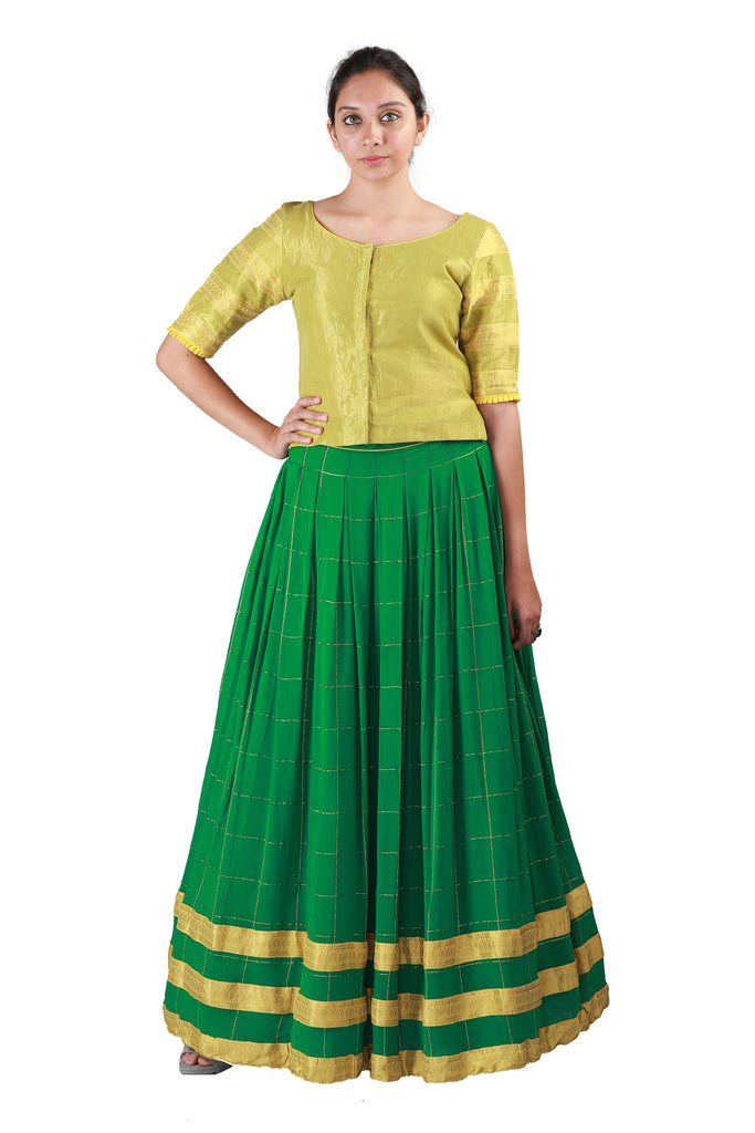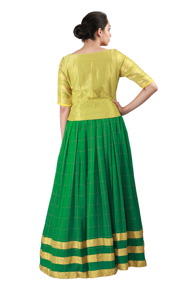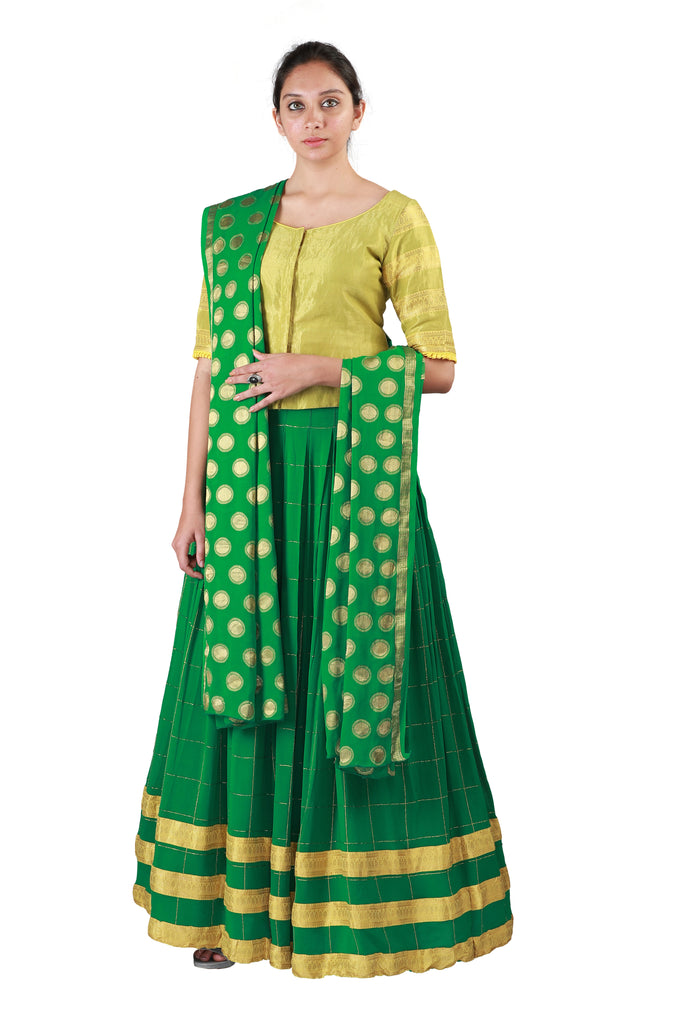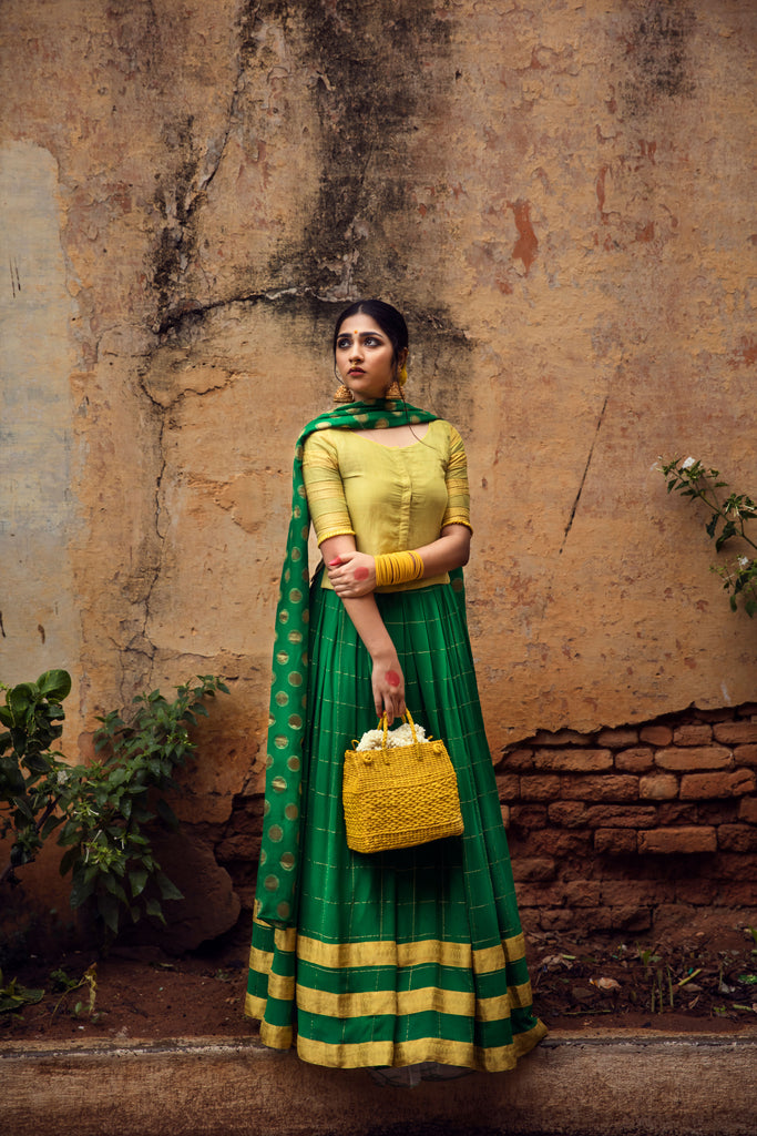 Recreate the magic of yesteryears with this gorgeous langa set comprising a yellow tissue blouse adorned with woven borders on sleeves, paired with a flowy green georgette skirt with gold checks and woven borders, as well as a matching dupatta in green embellished with gold polkas.