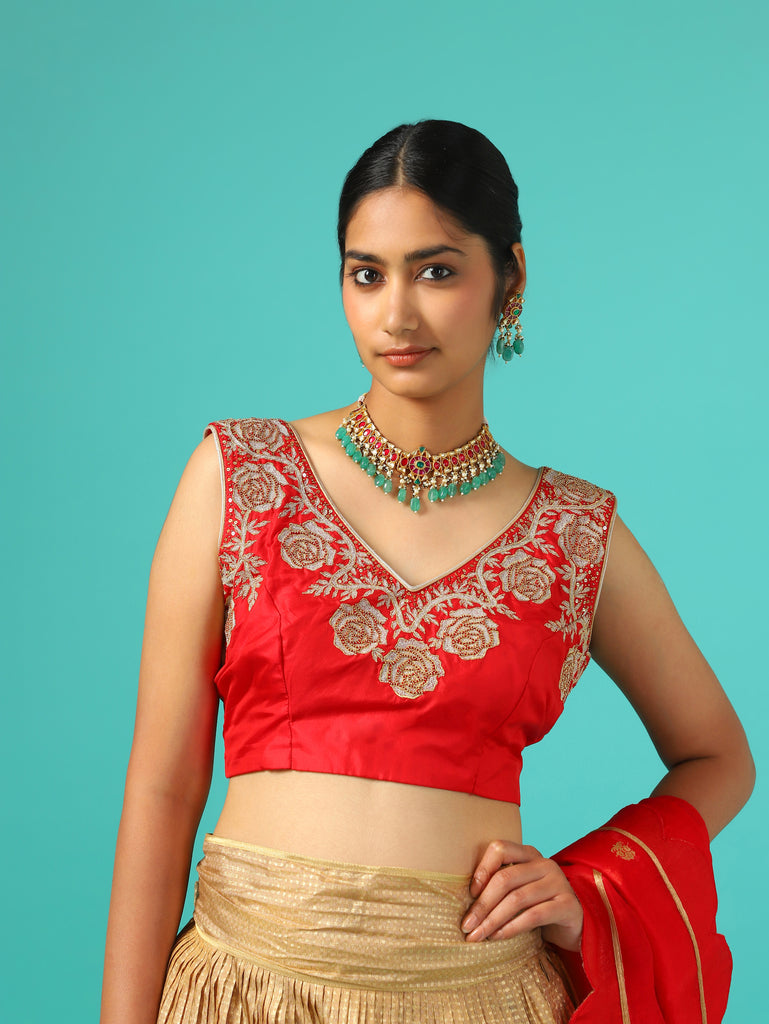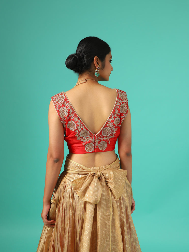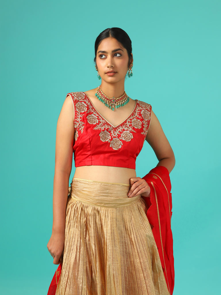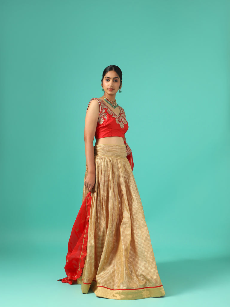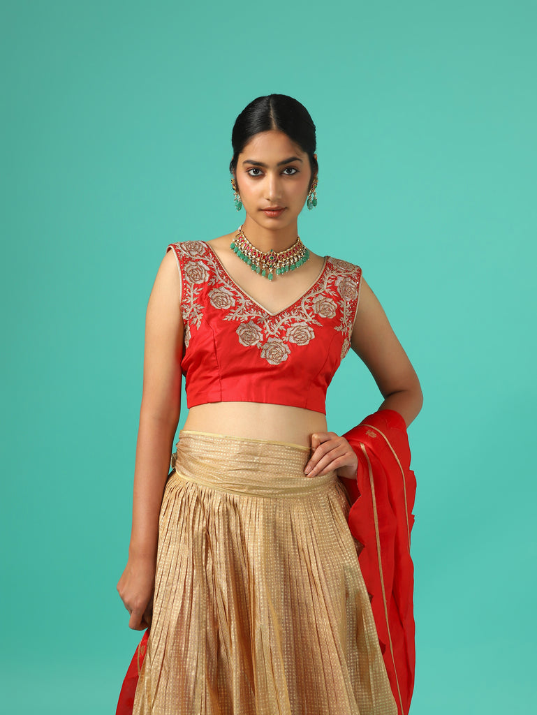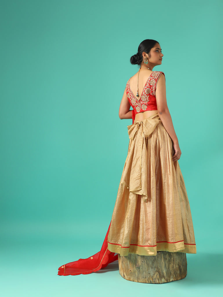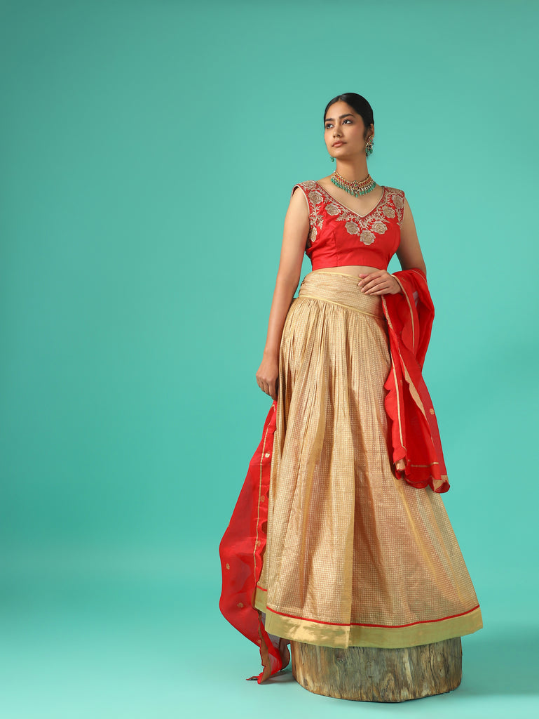 The Kogile Langa Davani Set features a Benaras tissue skirt with a double kadi print, finished with a Kanchi tissue border. It is paired with a silk blouse, embellished with crush tissue appliqué roses, along with bead and sequin detailing. The look is completed with an organza dupatta and a sash crafted from the same fabric as the skirt.