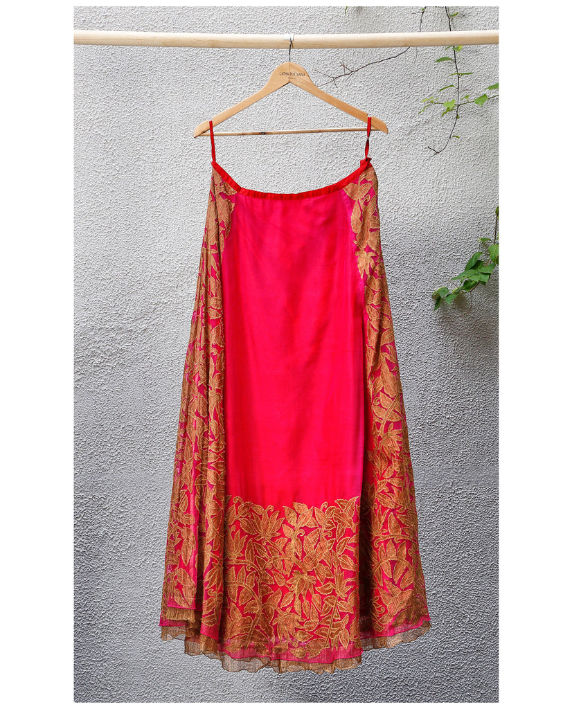 Long Description Skirt : Material - Banaras silk net, Colour - Orange, Embroidery - Gold crush applique in floral design on both sides and bottom border.