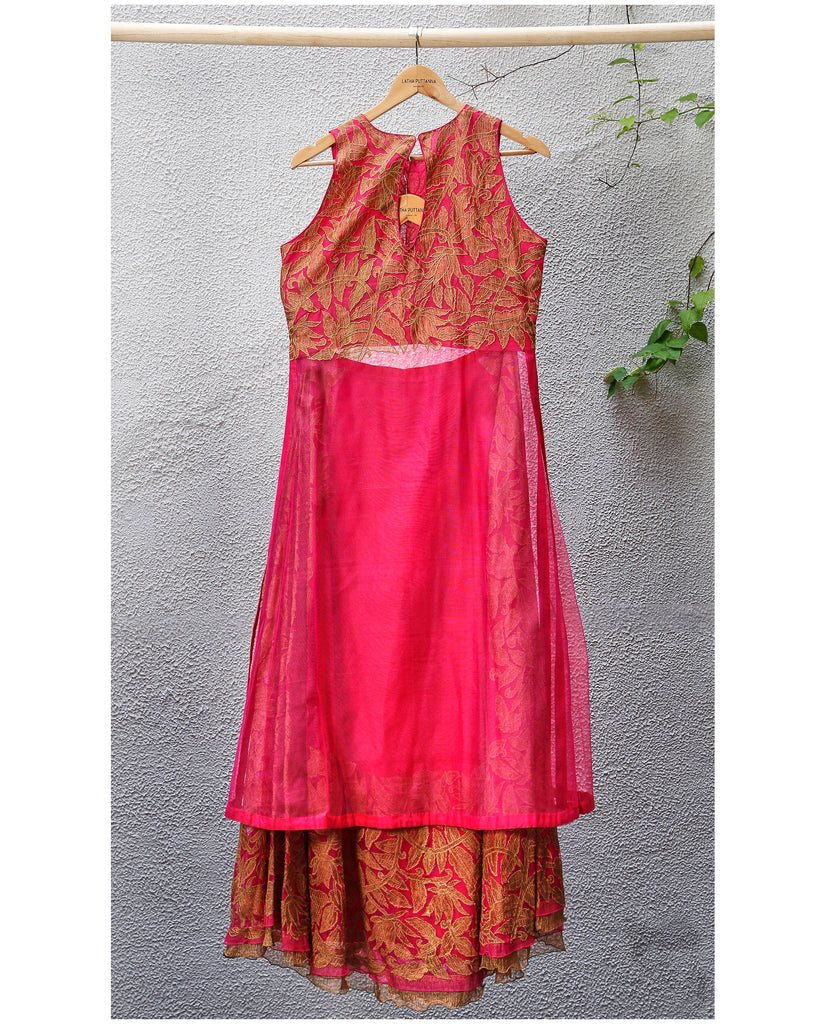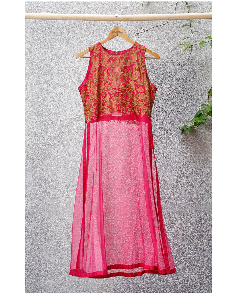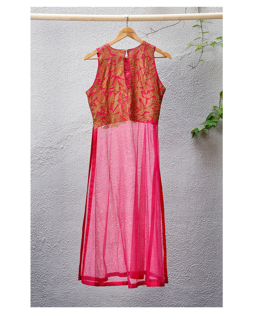 Long Description Choli : Material - Banaras silk net, Colour - pink, Embroidery - Gold crush applique in floral design on chest, Sleeves - sleeveless, Type - long.
