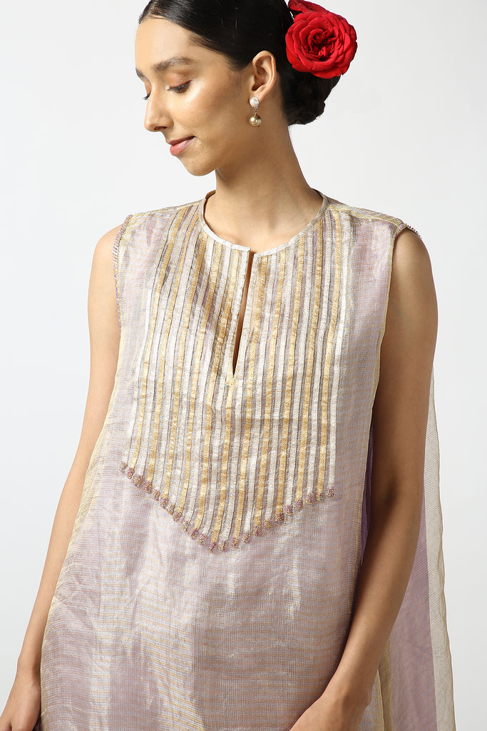 Banarasi Georgette Tissue Flare With Kanchi Gold and Silver Strip Yoke. Kanchi Tissue Pant.