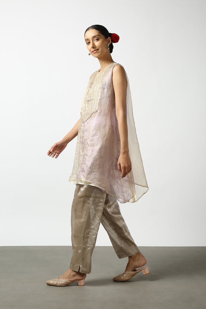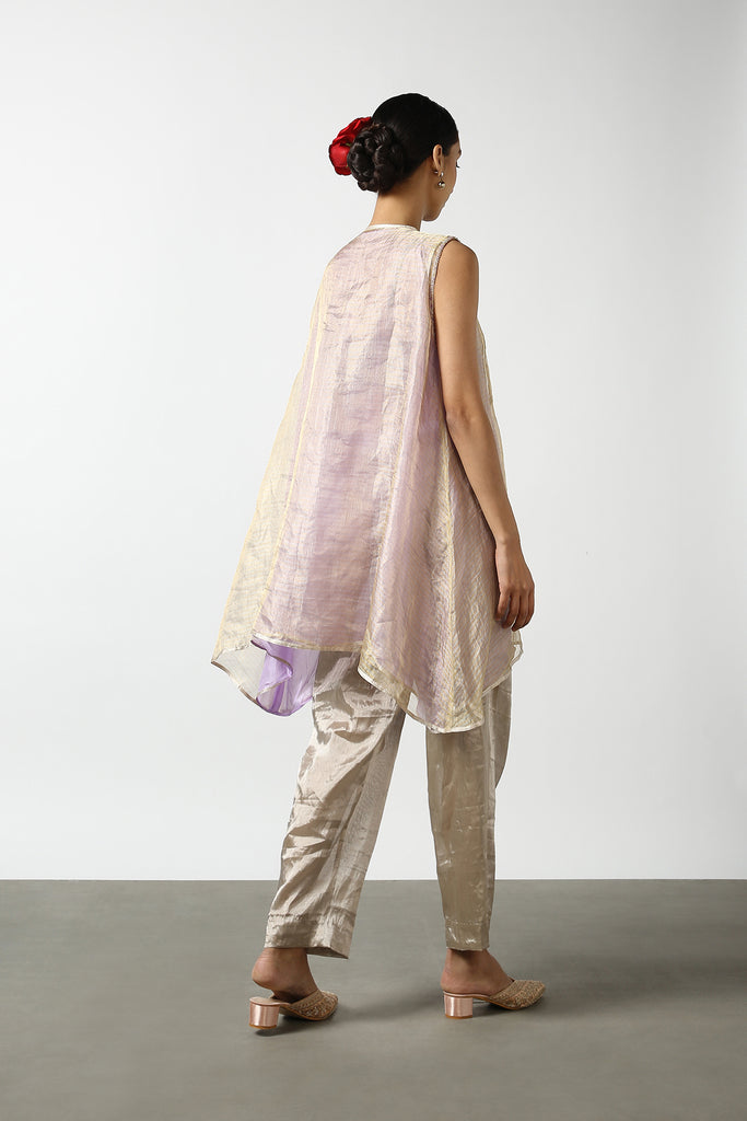 How does it feel to float like a butterfly? Find out by donning this delicate and breezy flare top in blue, made with an airy silk tissue fabric and detailed at the yoke with Kanchi silver and gold strips. Accompanying this breathable top is a lightweight pair of Kanchi tissue pants!