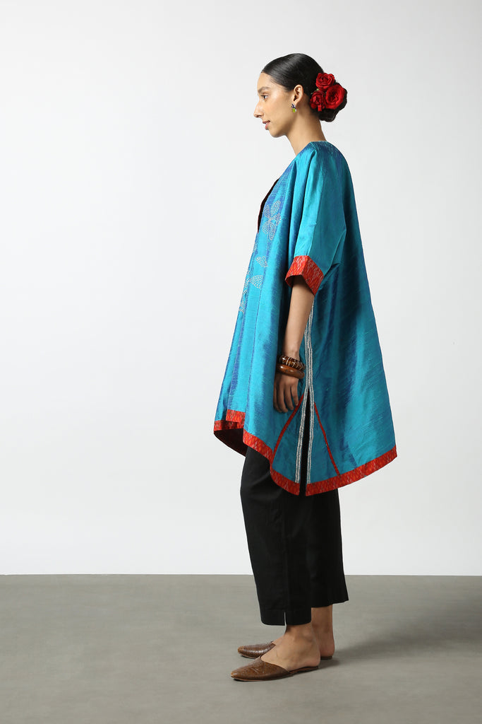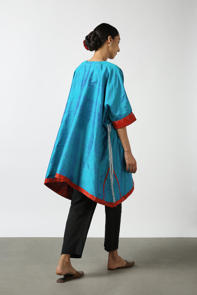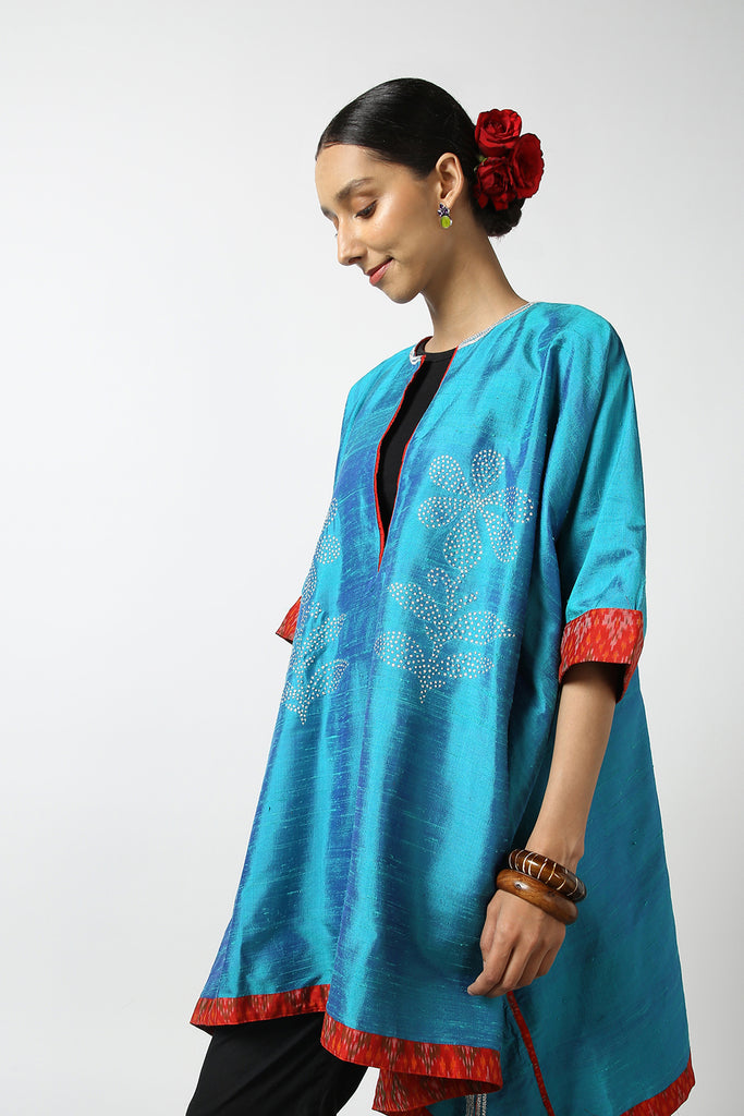 Blue Raw Silk Hand Embroidered Short Phiran Top
