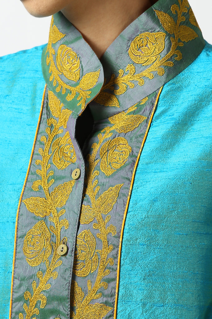 Love adding a touch of drama to your outfits? Elevate your look with this flambouyant and eye-catching raw silk phiran top in blue, detailed with hand embroidery. With its unique silhouette and collar detailing, this piece is sure to set you apart in a crowd!