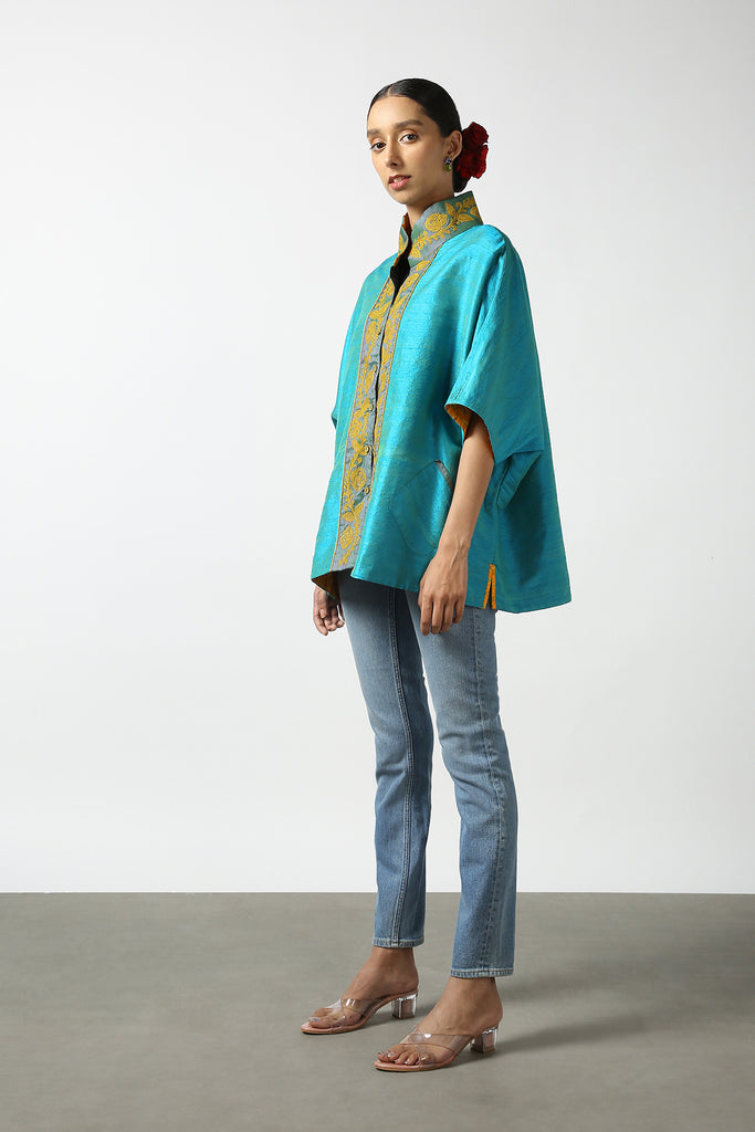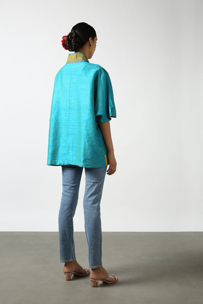 Blue Raw Silk Hand Embroidered Short Phiran Top