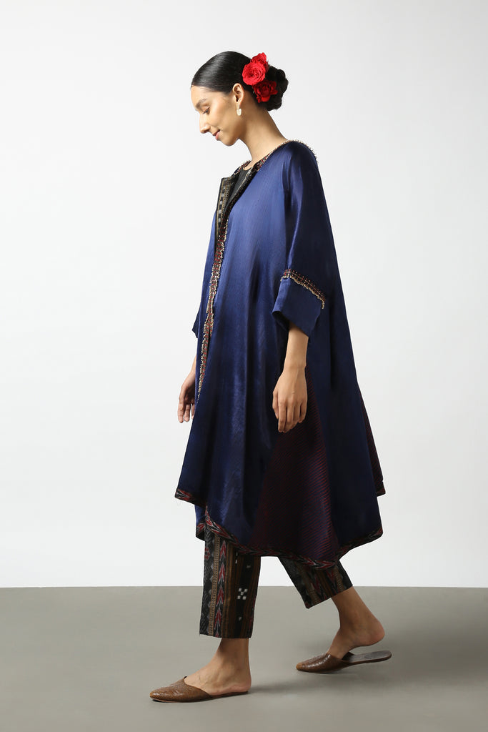 Have a flair for the dramatic? This long dark blue coat made from hand woven Ikkat and Mushru silk, with hand embroidery detailing, is just what you need to add that extra bit of oomph to any outfit. Just throw on a few simple neutrals underneath this jacket and let it (and yourself) shine!