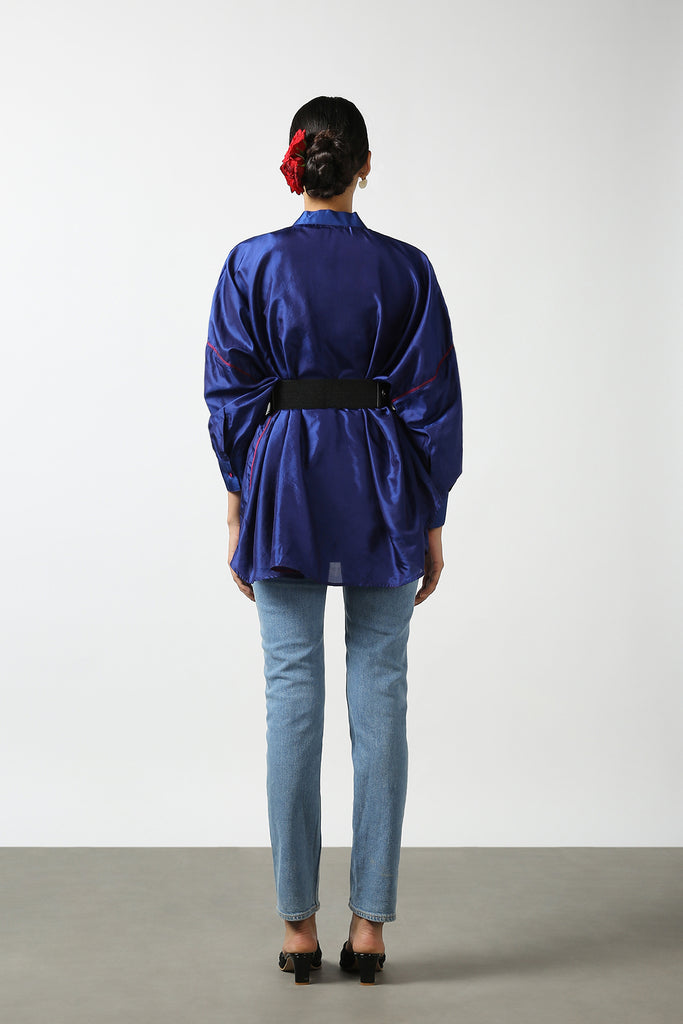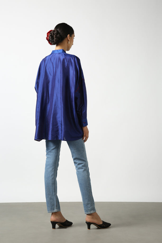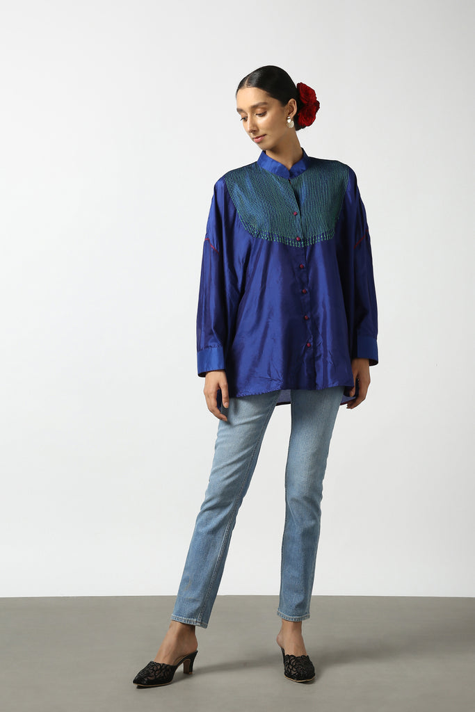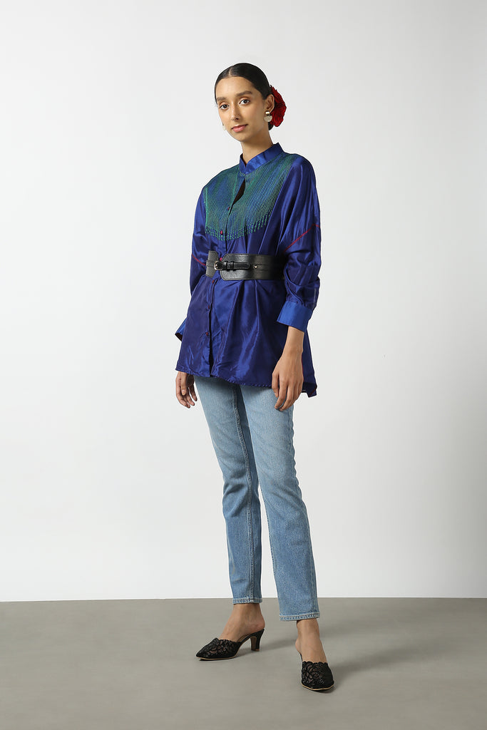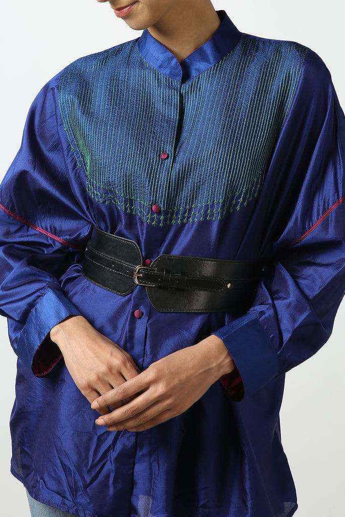 Dark Blue Raw Silk Hand Embroidered Short Phiran Top