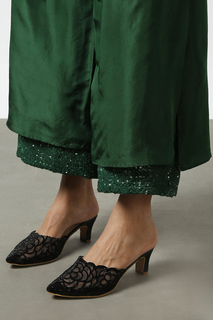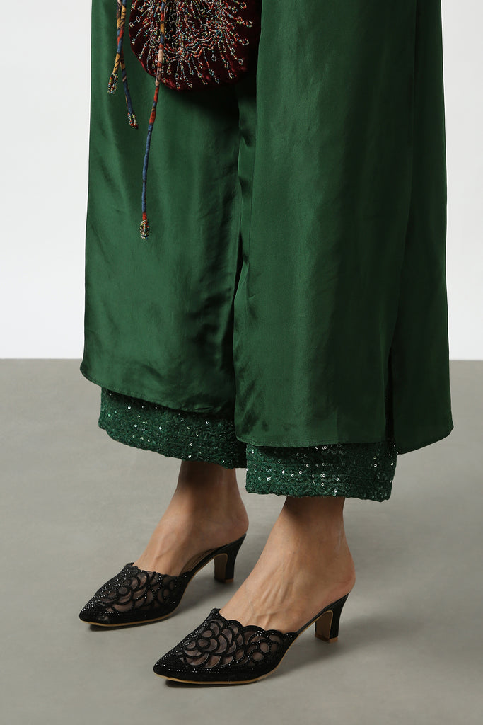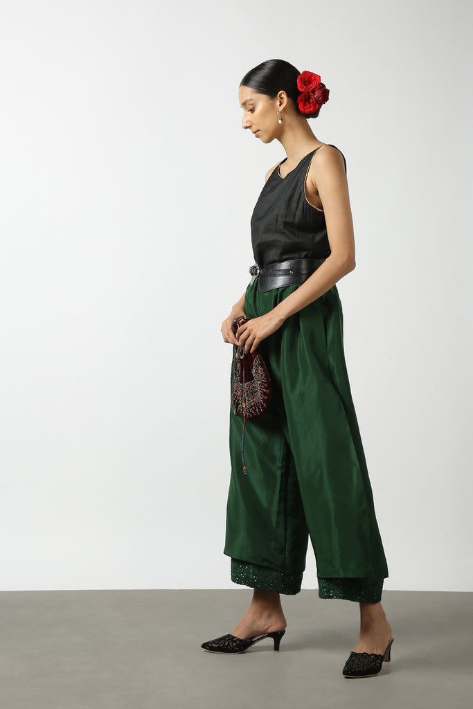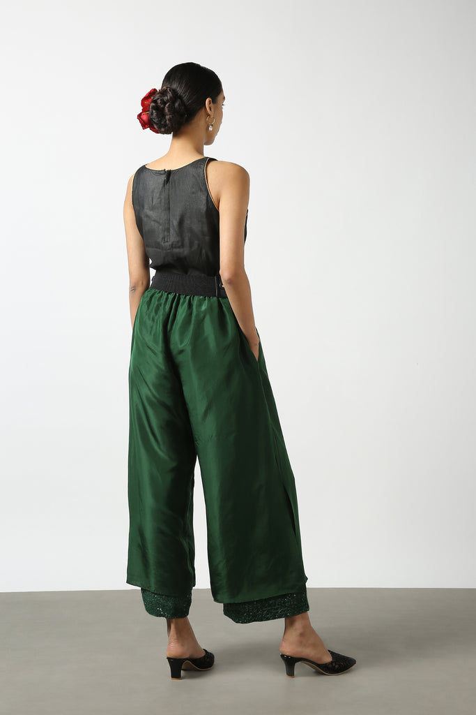 What's the secret to power dressing? This double-layered soft silk pair of pants in a dark green, adorned with self sequin work is the answer. Pair this versatile garment with a traditional or formal top and you're good to go for any occasion. It's a stylist's dream!