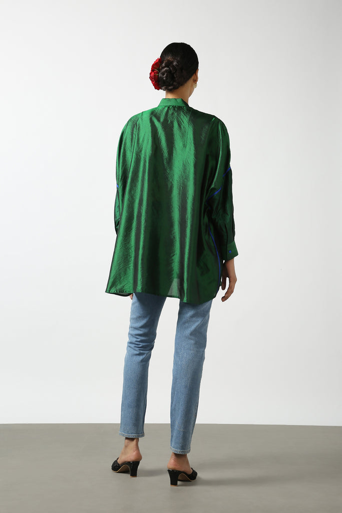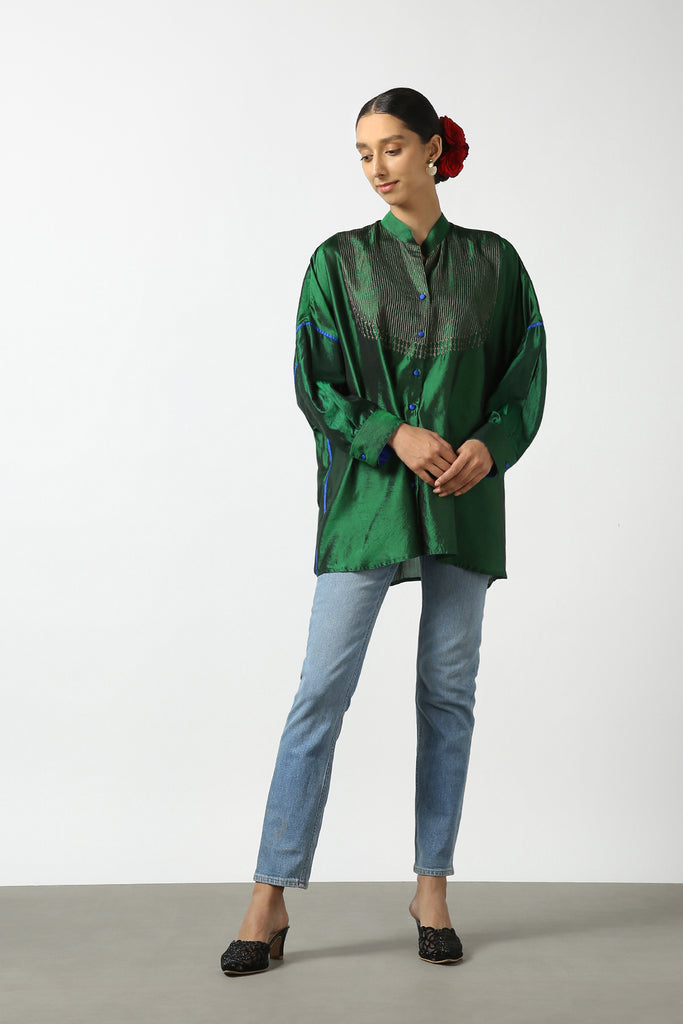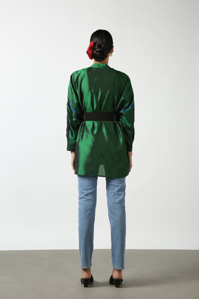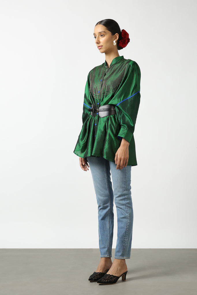 Dark Green Raw Silk Hand Embroidered Short Phiran Top