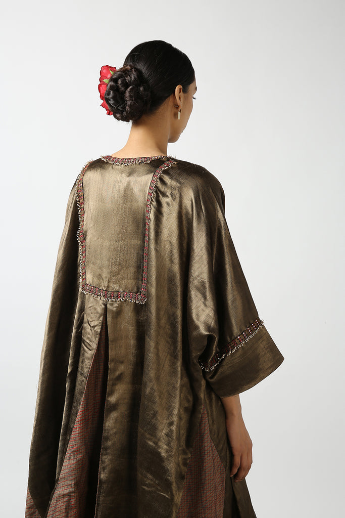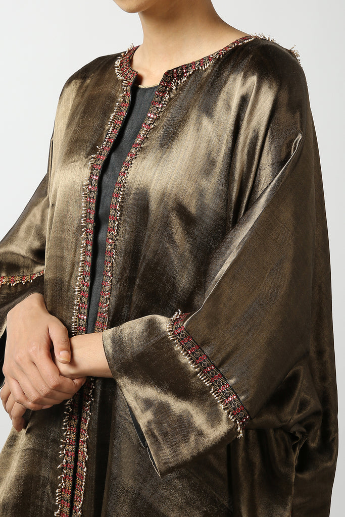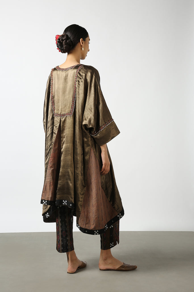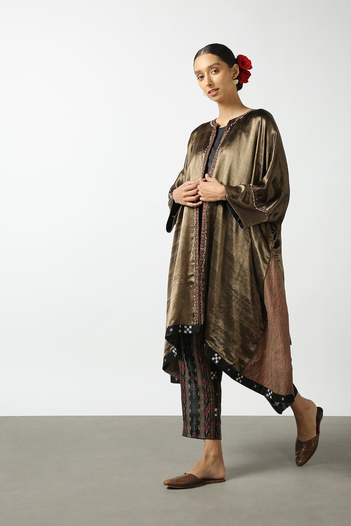 Have a flair for the dramatic? This long brown coat made from hand woven Ikkat and Mushru silk, with hand embroidery detailing, is just what you need to add that extra bit of oomph to any outfit. Just throw on a few simple neutrals underneath this jacket and let it (and yourself) shine!