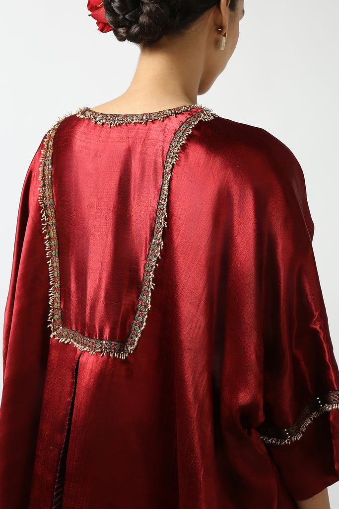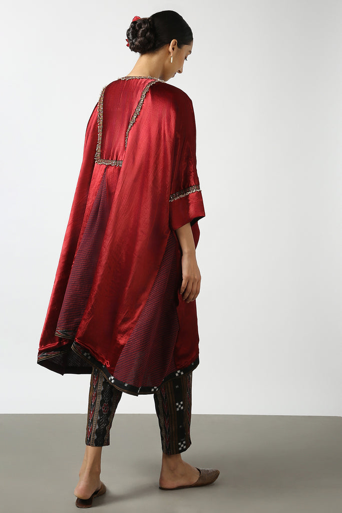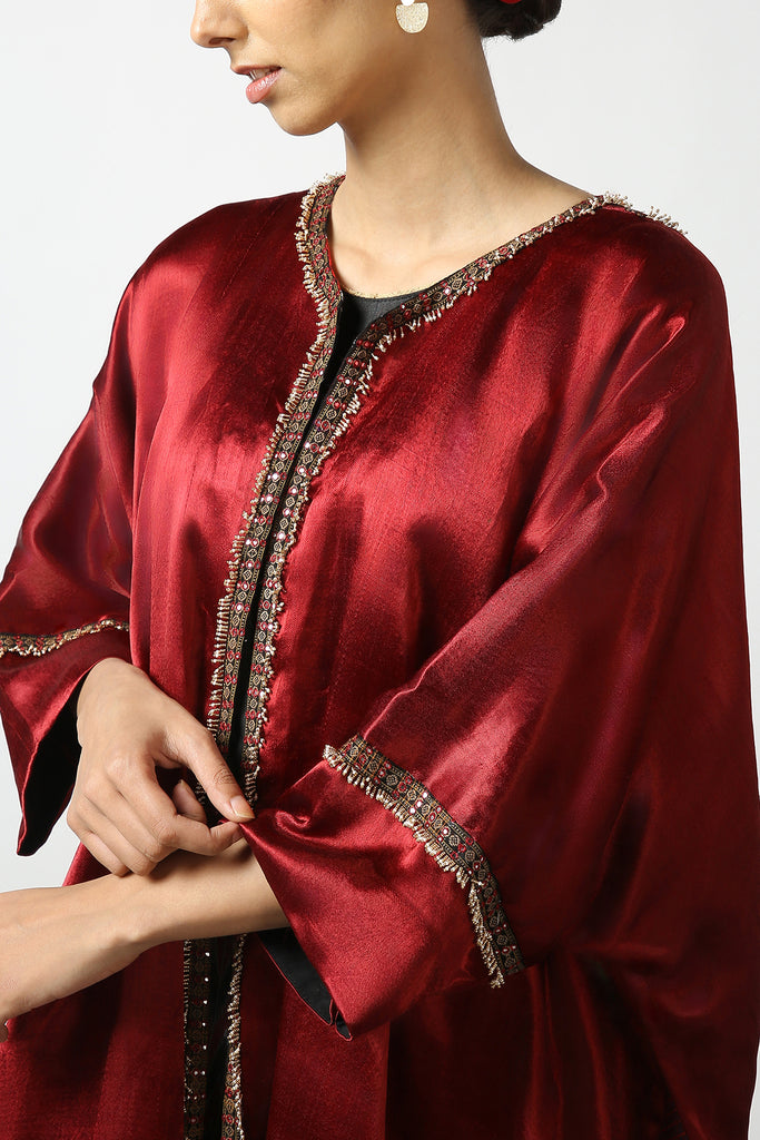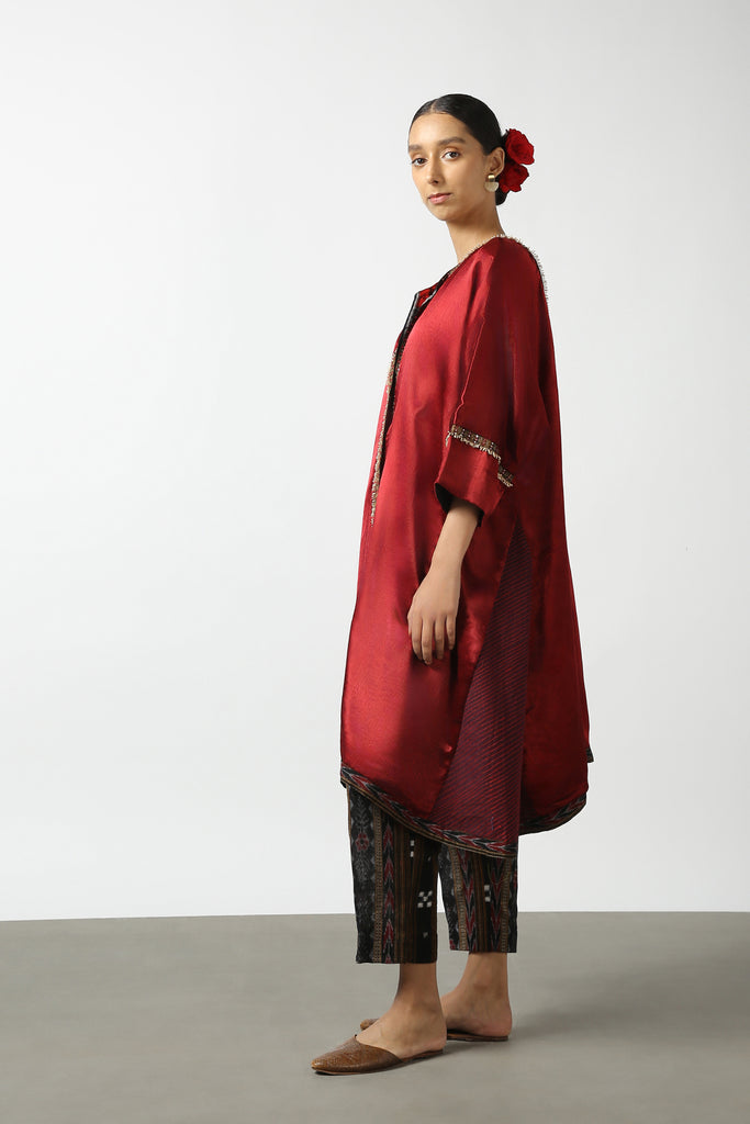 Have a flair for the dramatic? This long dark red coat made from hand woven Ikkat and Mushru silk, with hand embroidery detailing, is just what you need to add that extra bit of oomph to any outfit. Just throw on a few simple neutrals underneath this jacket and let it (and yourself) shine!