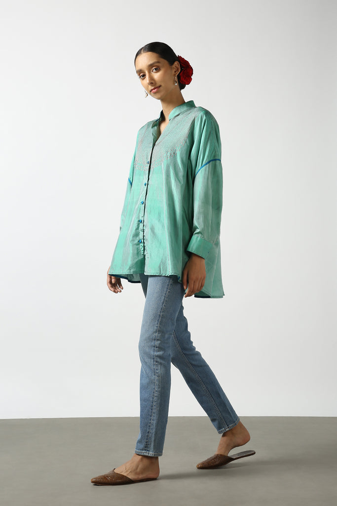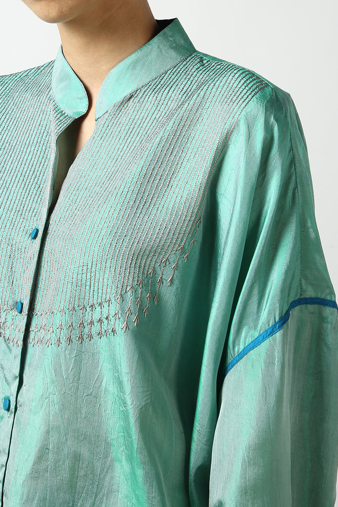 Green Raw Silk Hand Embroidered Short Phiran Top