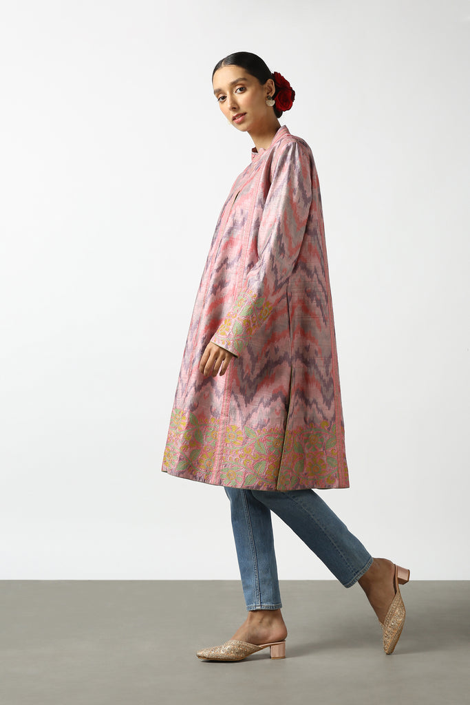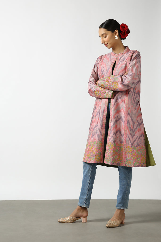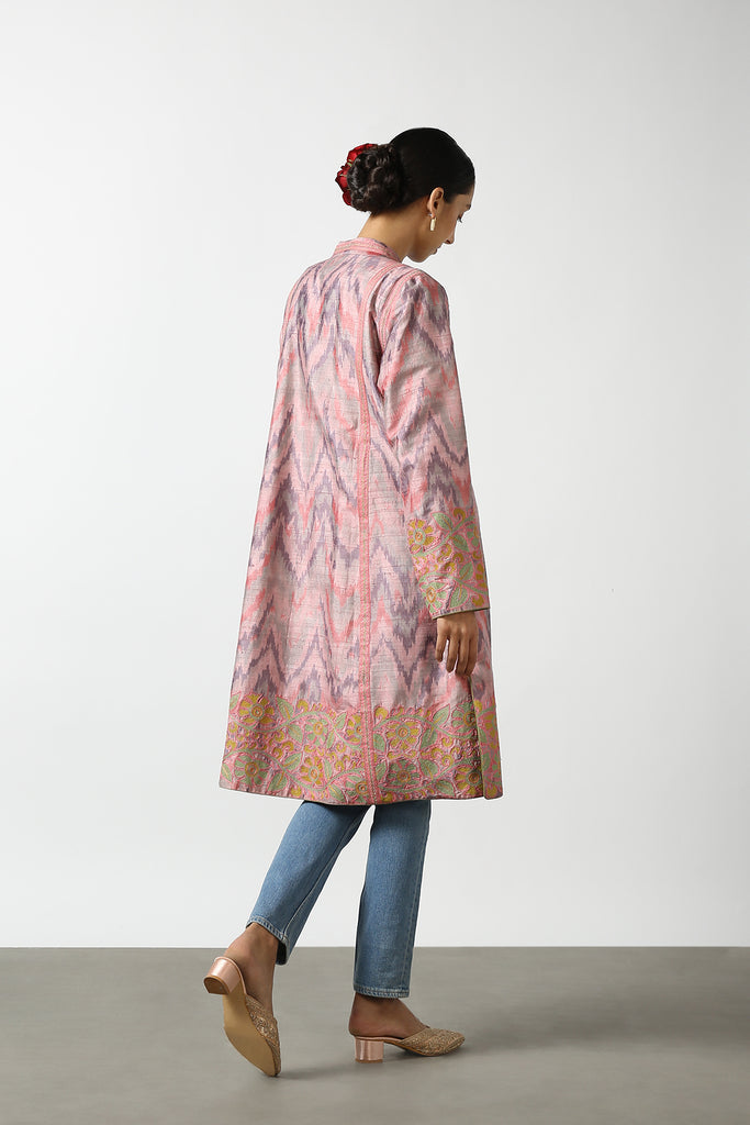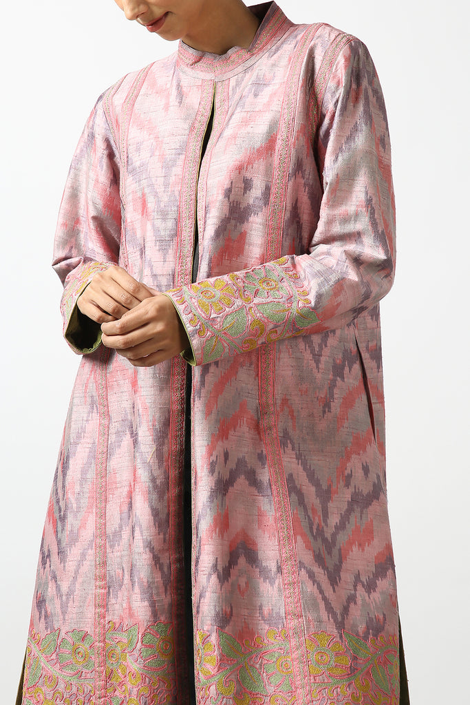Have a flair for the dramatic? This long light blue coat made from hand woven Ikkat silk, with hand embroidery detailing, is just what you need to add that extra bit of oomph to any outfit. Just throw on a few simple neutrals underneath this jacket and let it (and yourself) shine! Did we mention it's reversible too?