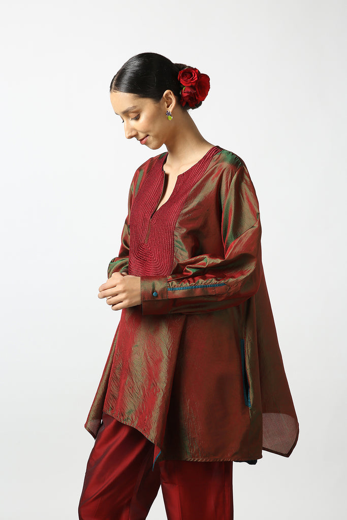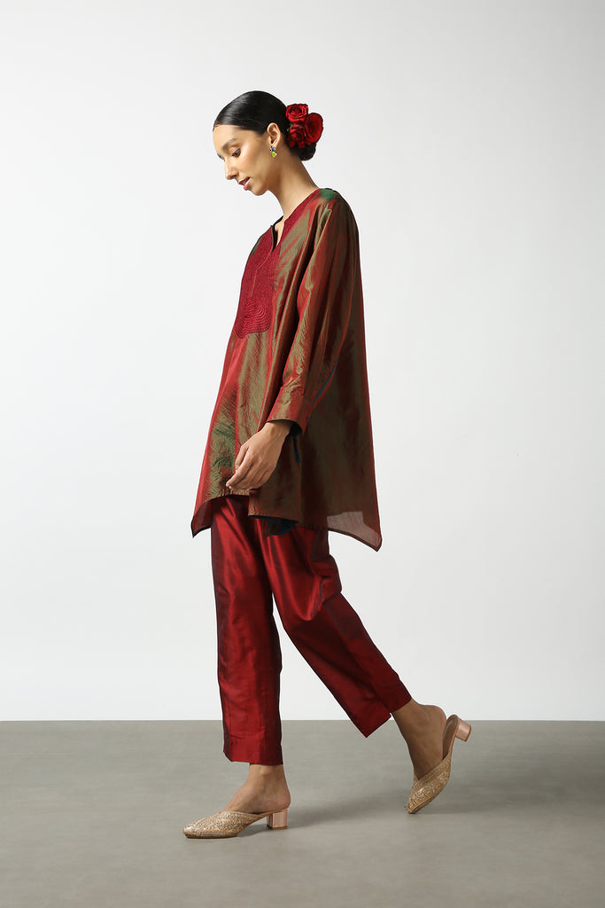 Dream of looking alluring, mystical, and runway ready? Make every entry of yours a showstopper moment with this stunning two-tone raw silk short phiran top in sea green, detailed with hand embroidery.
