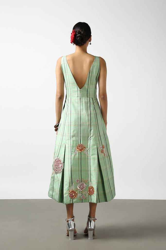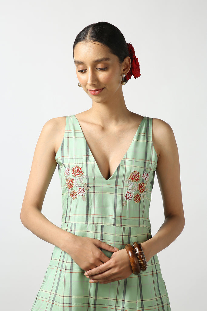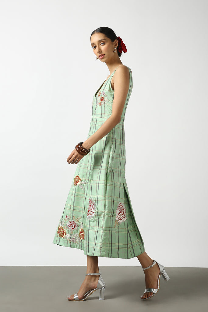 There she is... the centrepiece of our collection – the iconic Huli Vesha dress in mint green. Detailed with Latha Puttanna's signature hand embroidered tiger and rose motifs, this flowy and feminine dress made with Karnataka woven silk is a must-have for any summer soirée that will make you look like a vision in green.