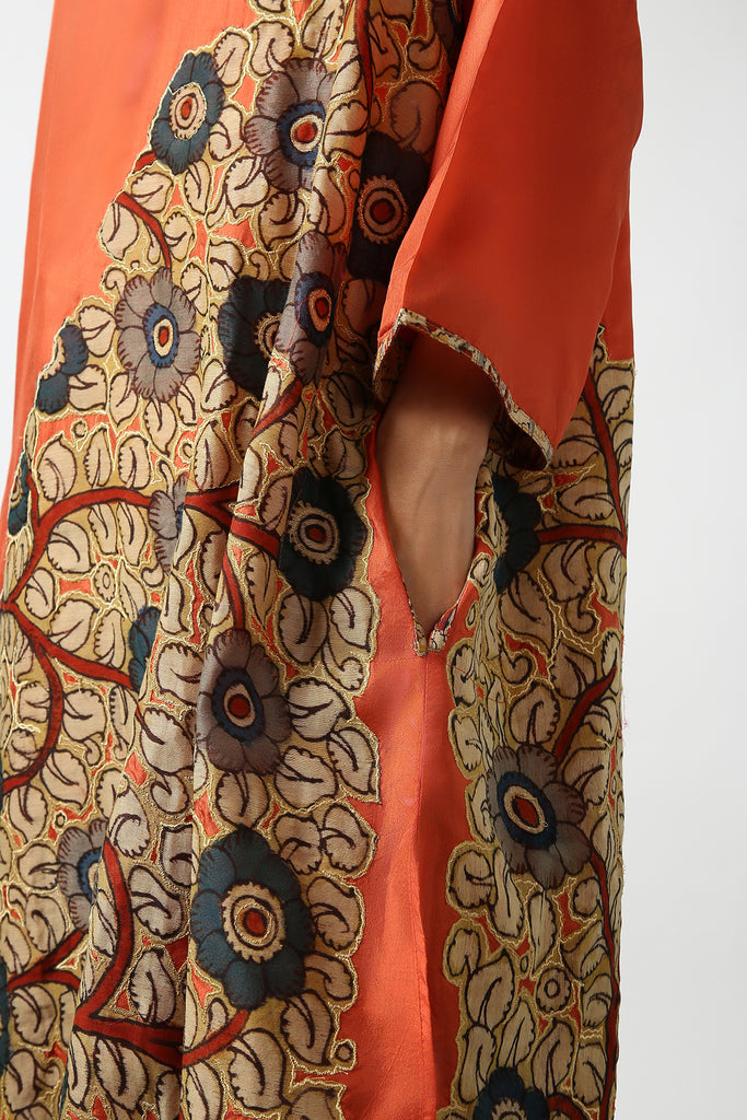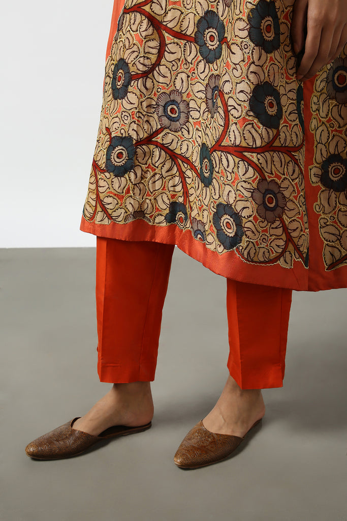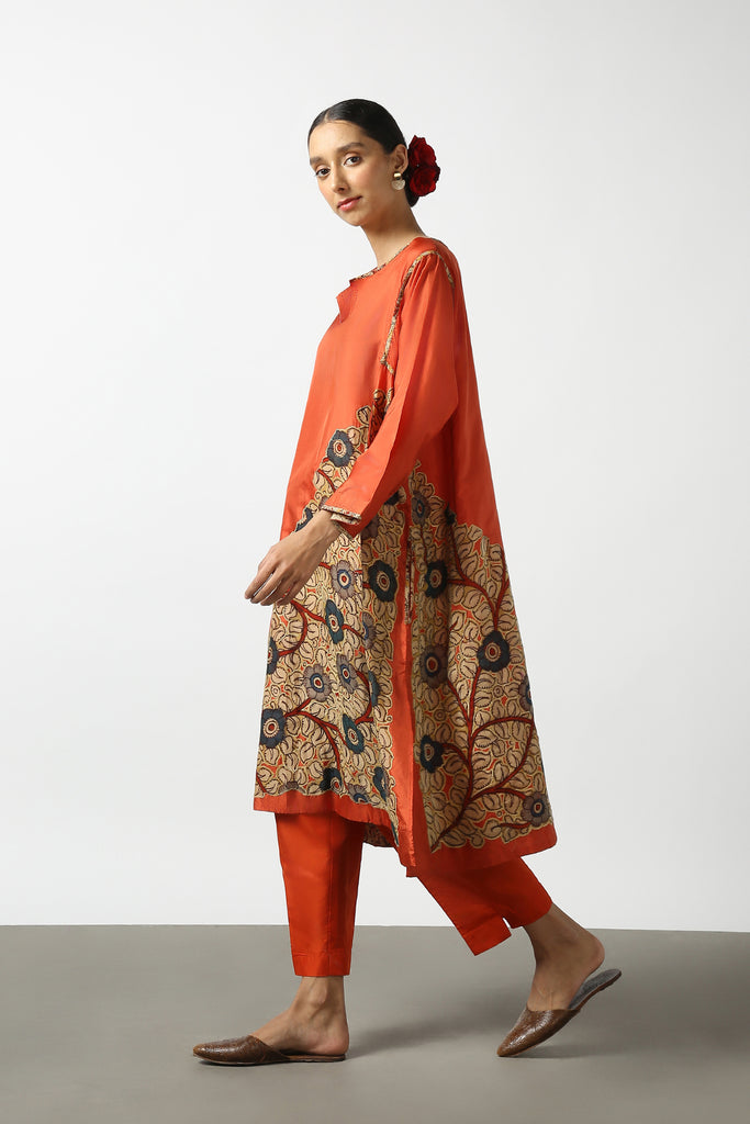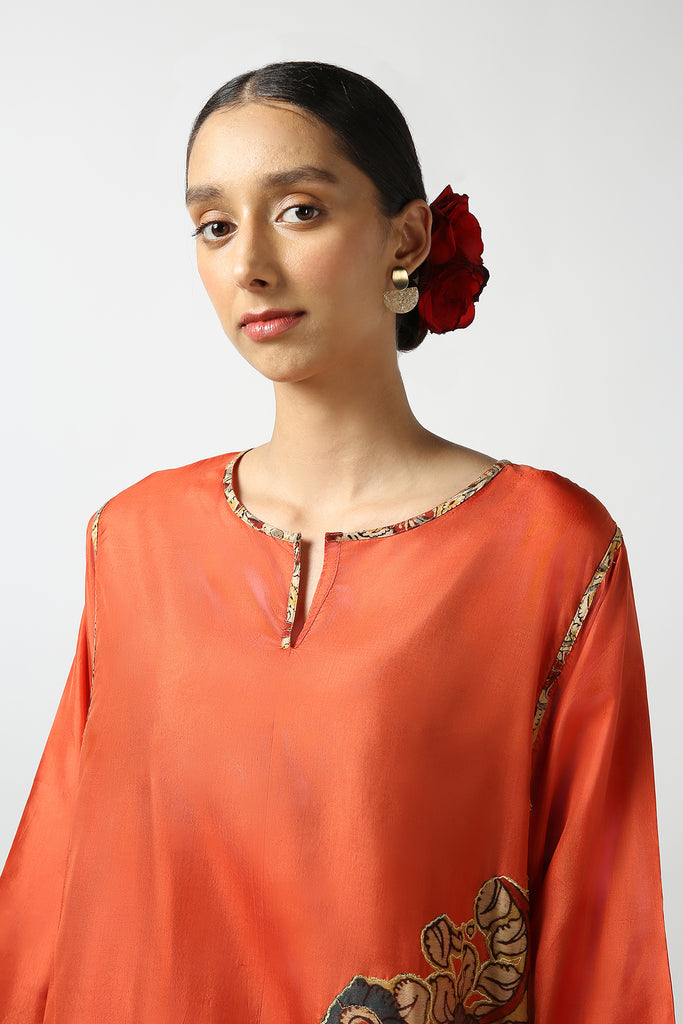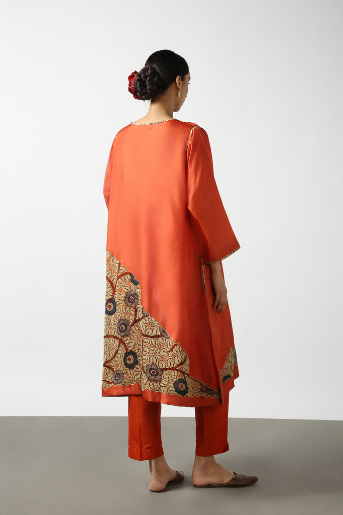 Orange Kalamkari Applique Silk Tops With Kanchi Cotton Pants