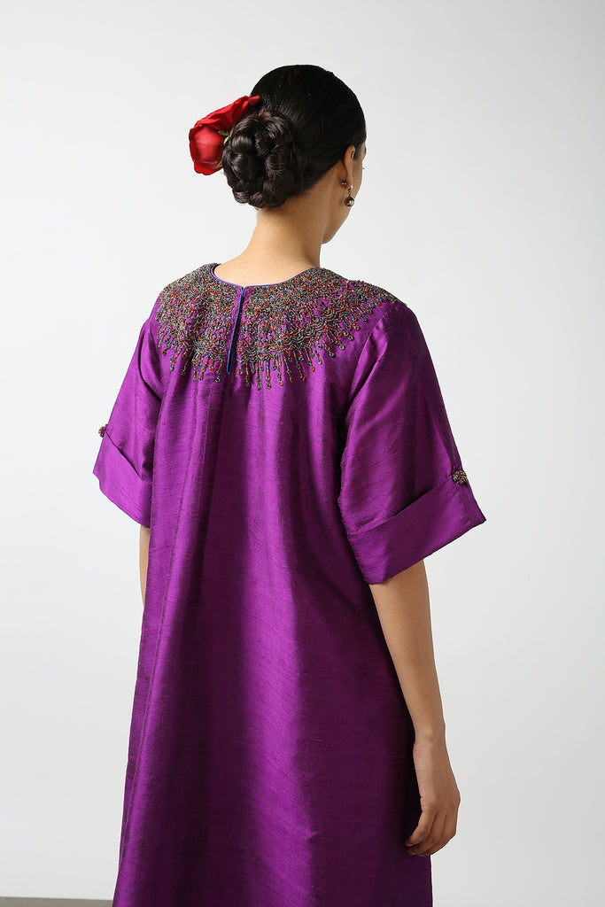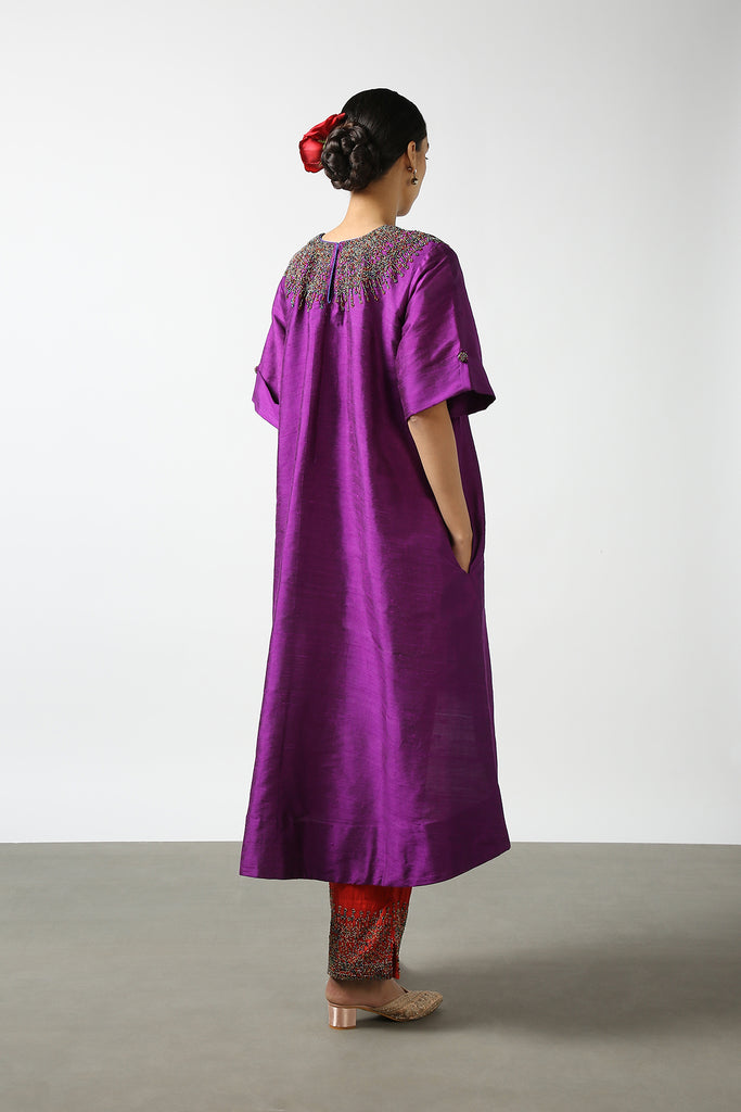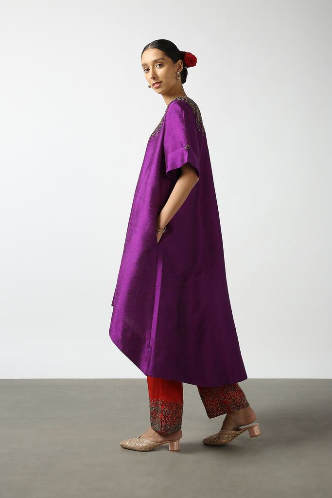 There's a reason why jewel tones are considered striking and powerful. With an amethyst tone as regal and commanding as you, this raw silk top in deep purple is the perfect choice for an intimate occasion. What makes the vibrant hue stand out even more is the multicolored beadwork detailing on the neck that adds an interesting yet subtle contrast.