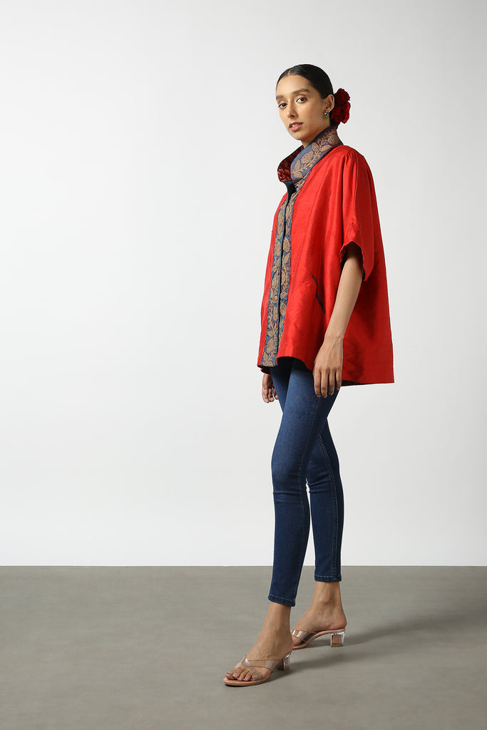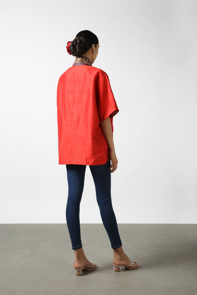 Red Raw Silk Hand Embroidered Short Phiran Top