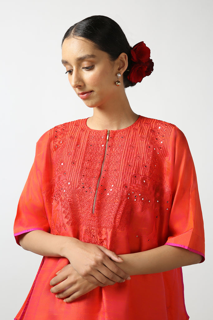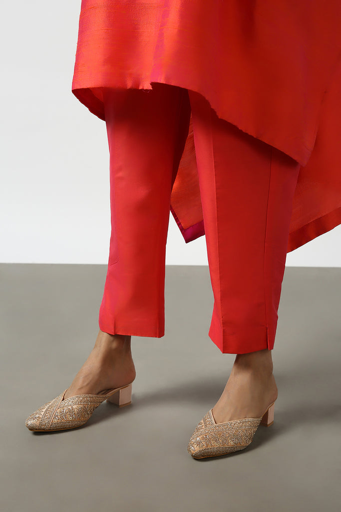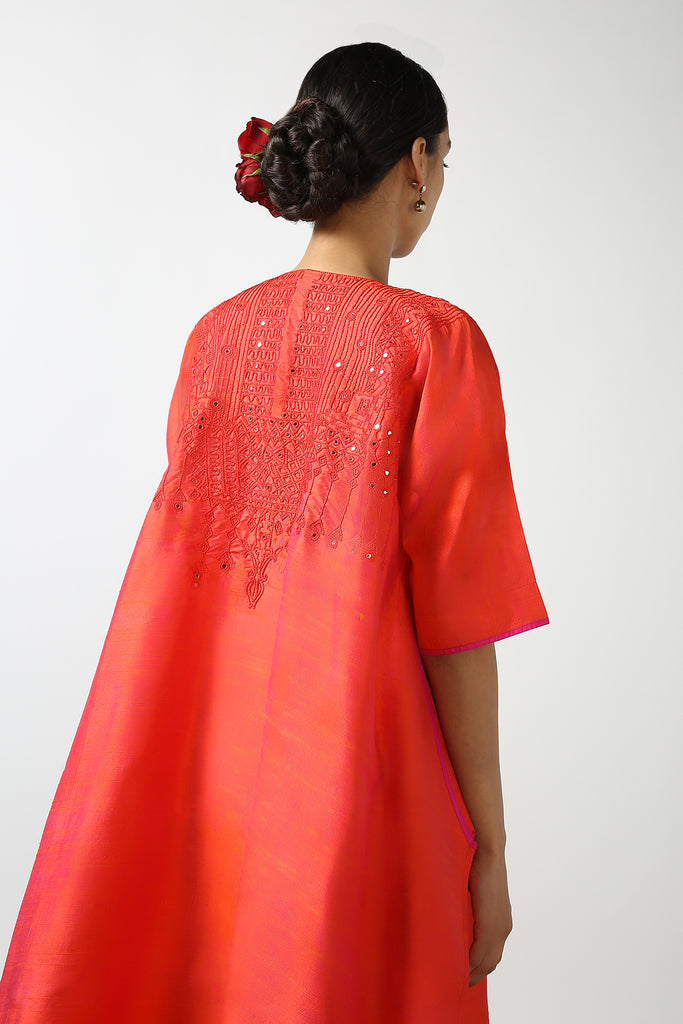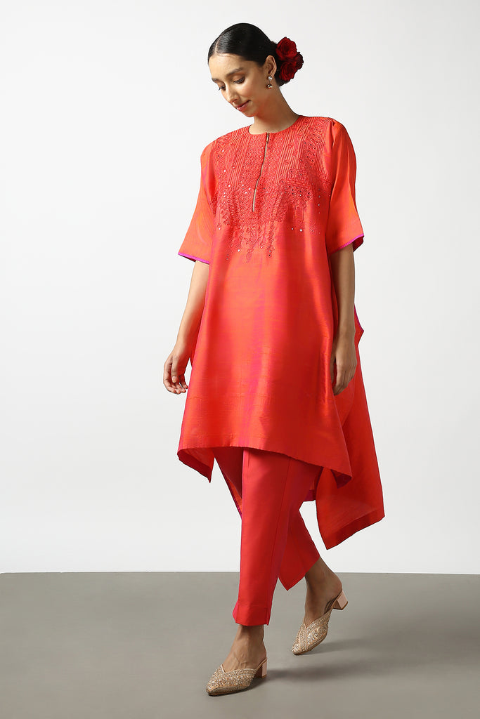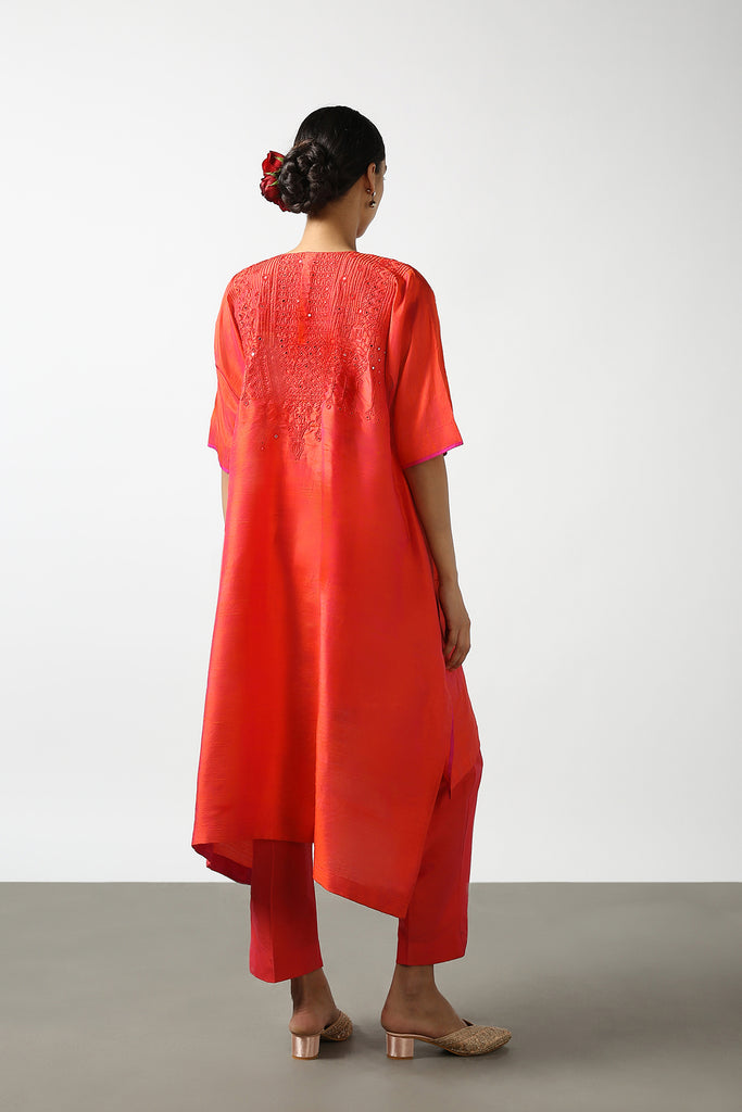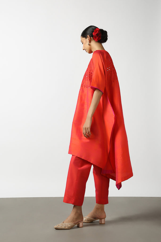 Red Raw Silk Top with Mirror Work Yoke. Tussar Pant or M. Giri Pant.