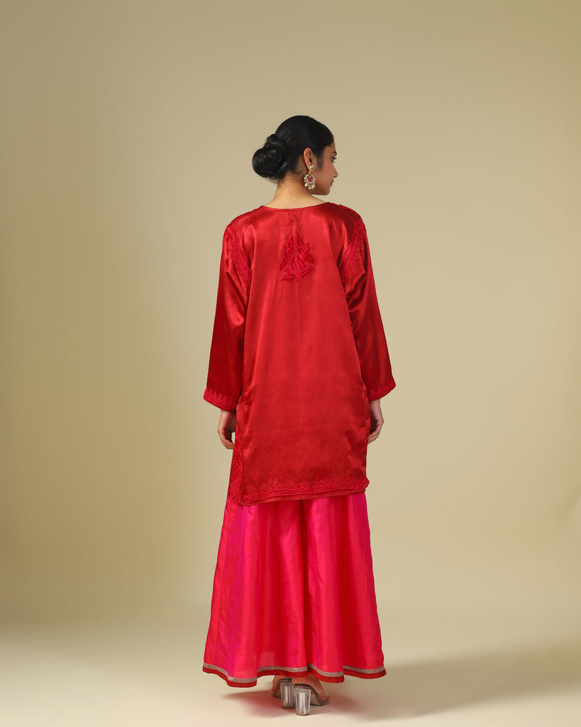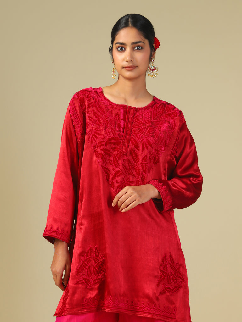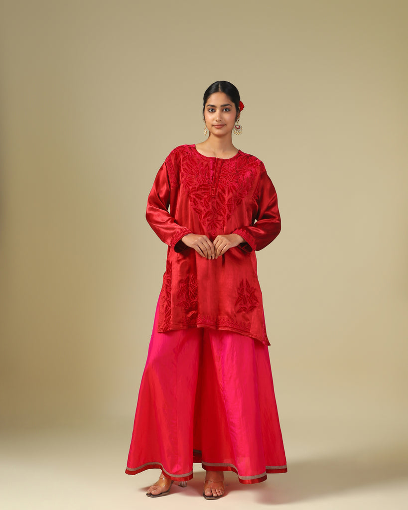 Crafted in a rich fusion of Mashru Silk, Chintamani Silk, and Velvet, this salwar set radiates vibrancy and depth. The warm elegance of Fire Brick flows seamlessly into the spirited brightness of Folly Pink, creating a rich, tonal harmony. Appliqué detailing lends a handcrafted charm, adding texture and character to this expressive ensemble — perfect for festive occasions with a contemporary twist.