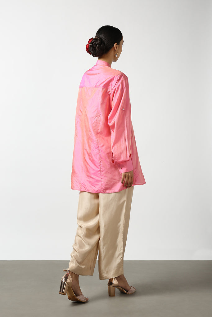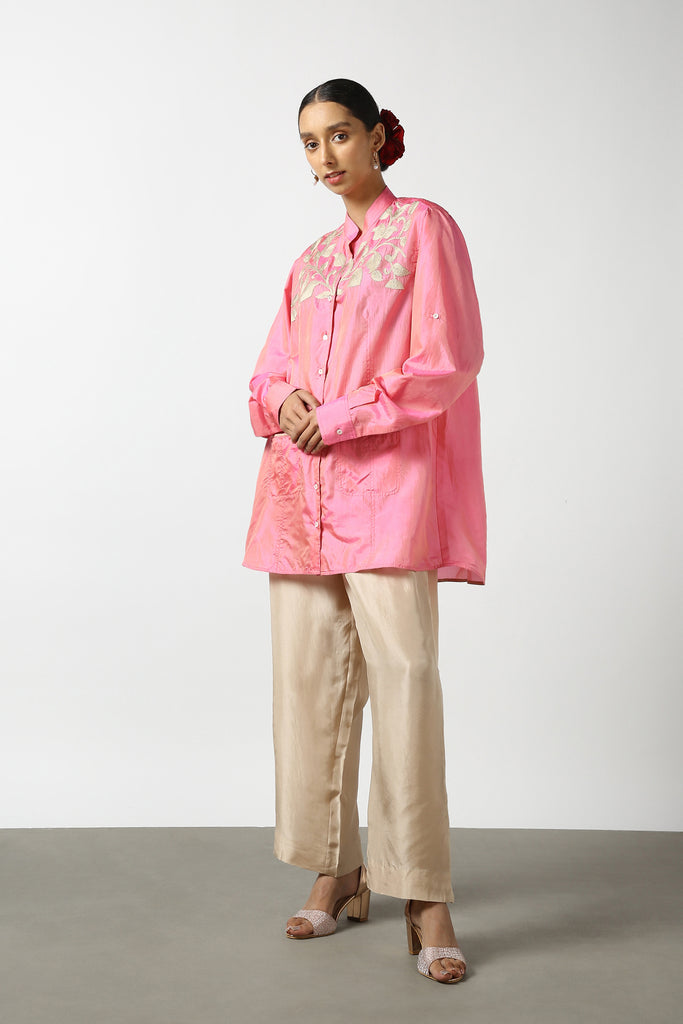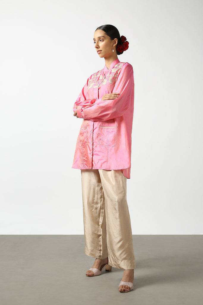 If you're a fan of silk that makes you feel like a million bucks, this gorgeous baby pink shirt is your saviour! Detailed with resham loading hand embroidery, this two-tone silk shirt will make you worthy of the spotlight wherever you go.