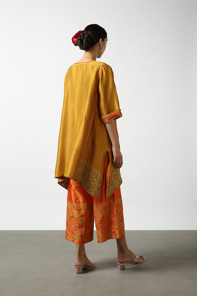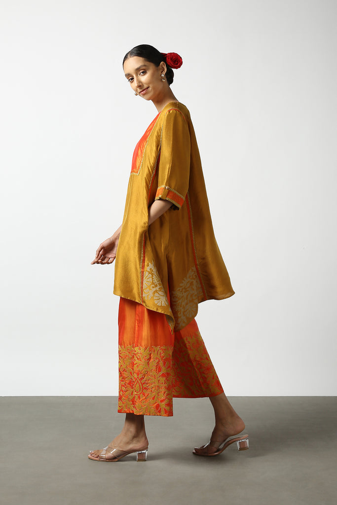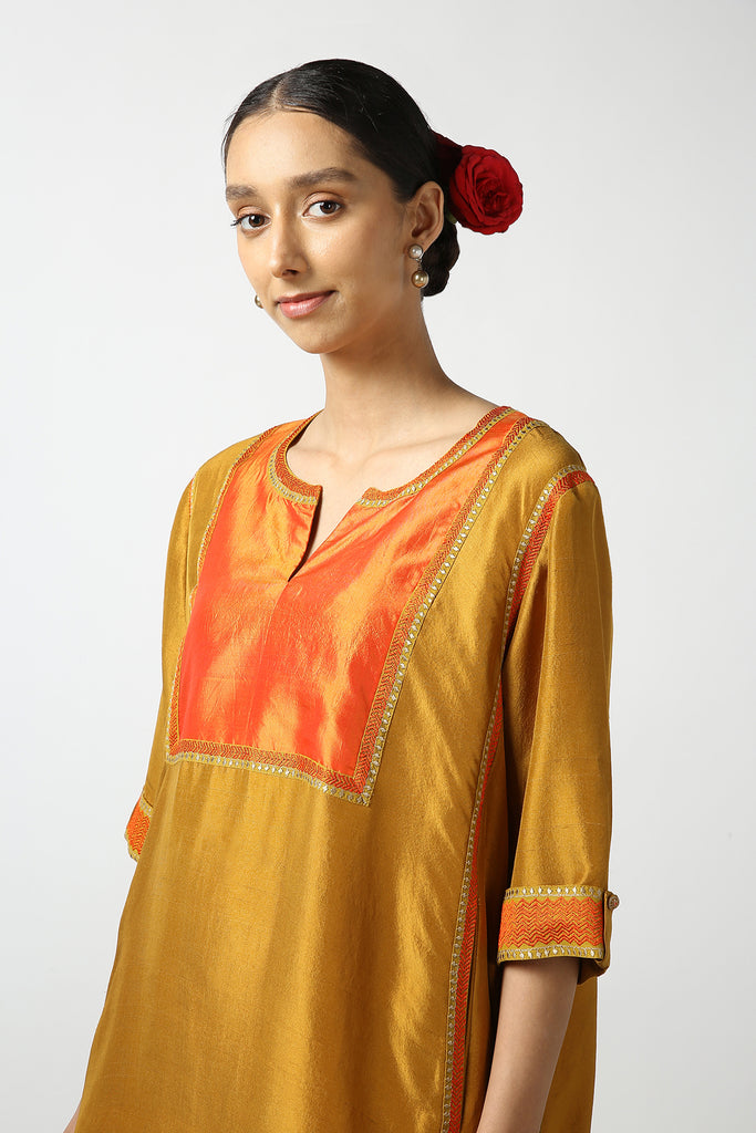 Have a thing for intricate mirror work? We bring you a luxurious slub silk top in mustard that's as bright and radiant as you. Detailed with a machine work border at the yoke and applique work, its relaxed silhouette and elbow length sleeves promise great comfort and great coverage for the harsh summer months!