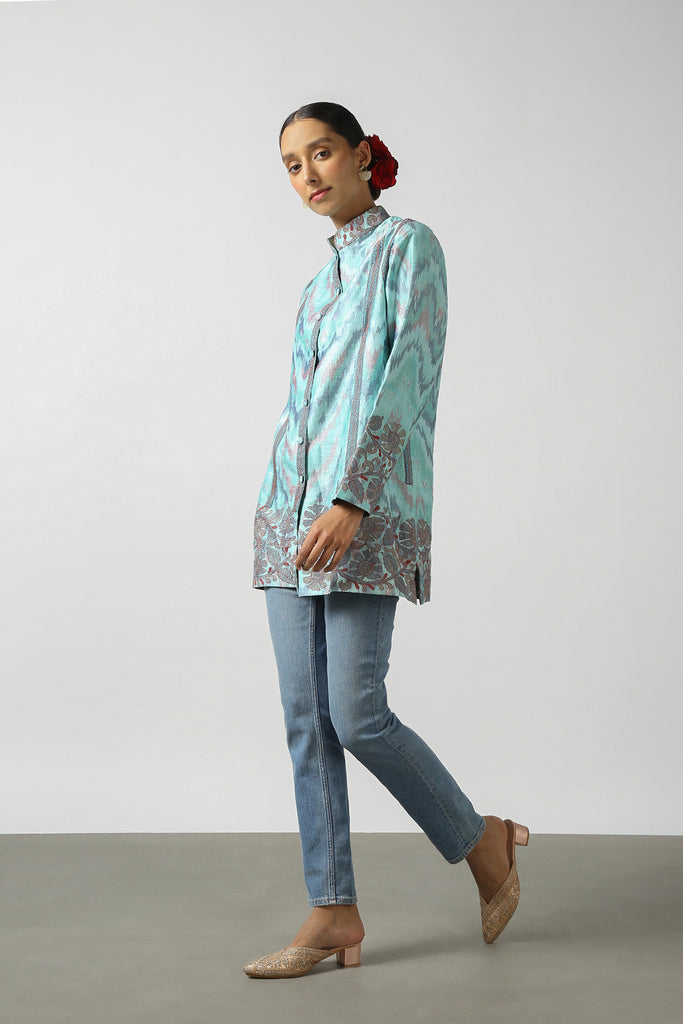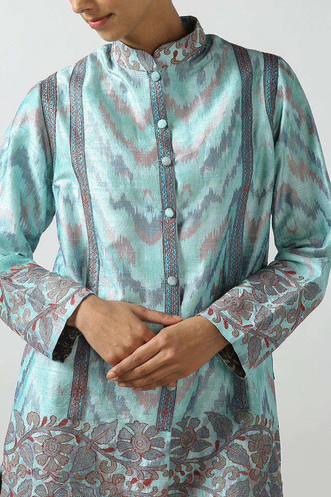 Have a flair for the dramatic? This long light blue coat made from hand woven Ikkat silk, with hand embroidery detailing, is just what you need to add that extra bit of oomph to any outfit. Just throw on a few simple neutrals underneath this jacket and let it (and yourself) shine! Did we mention it's reversible too?