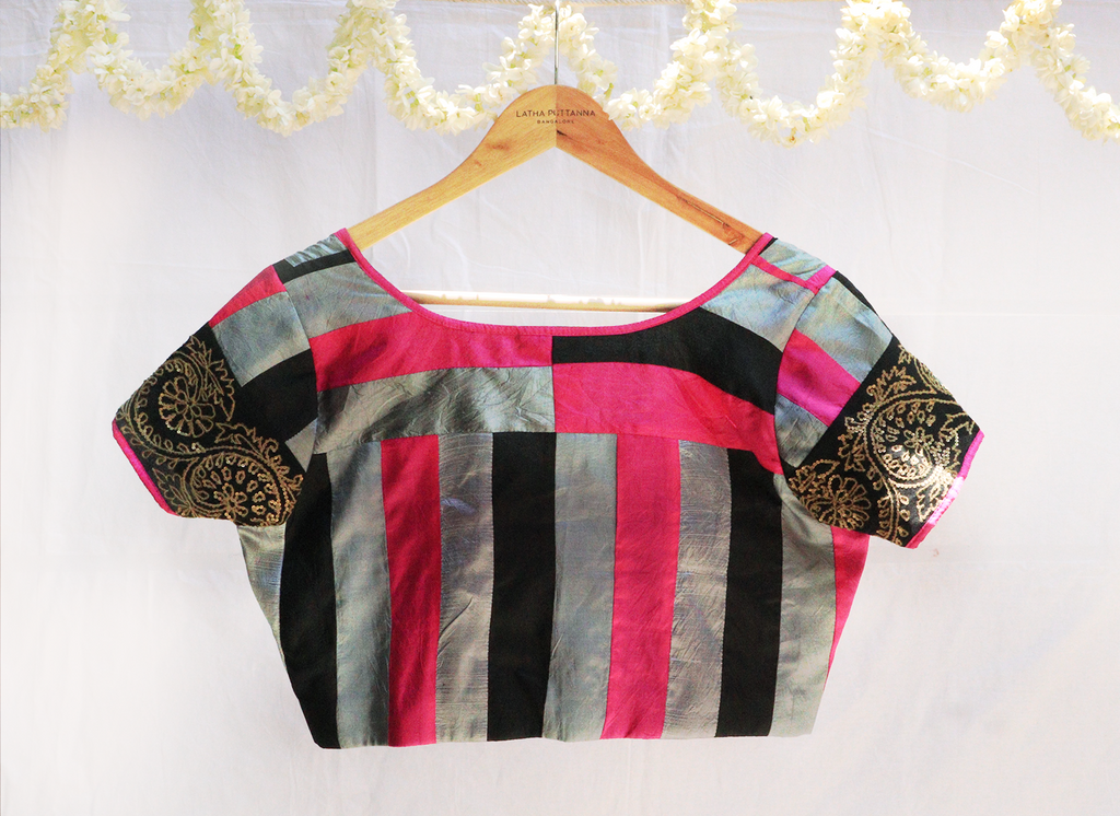 Pink, Grey and Black, Karnataka silk , Hand Embroidery ,Patchwork blouse