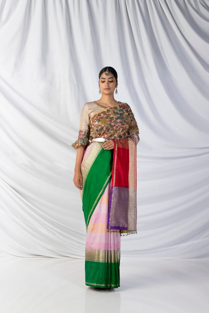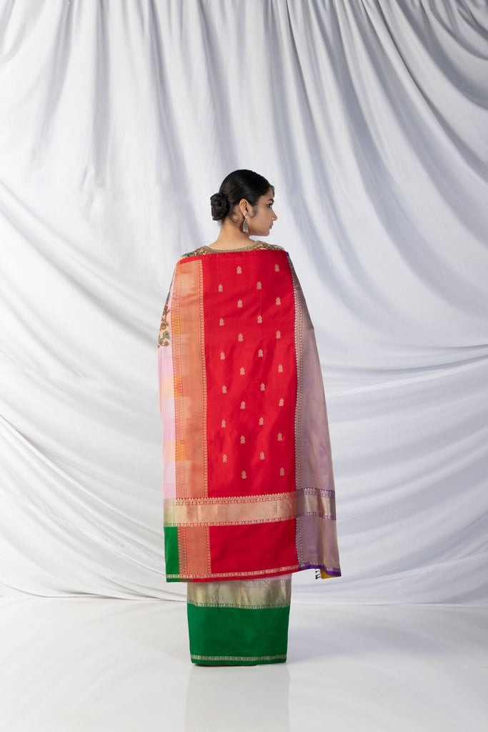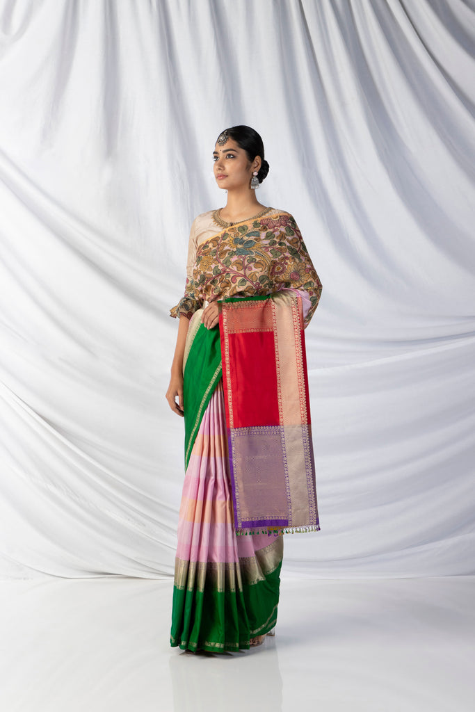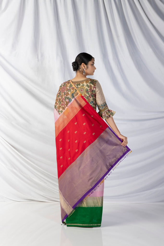 Crimson Red, Indigo, Forest Green and Shades of Pink Anchu Saree and Blouse