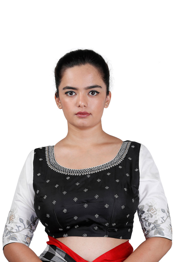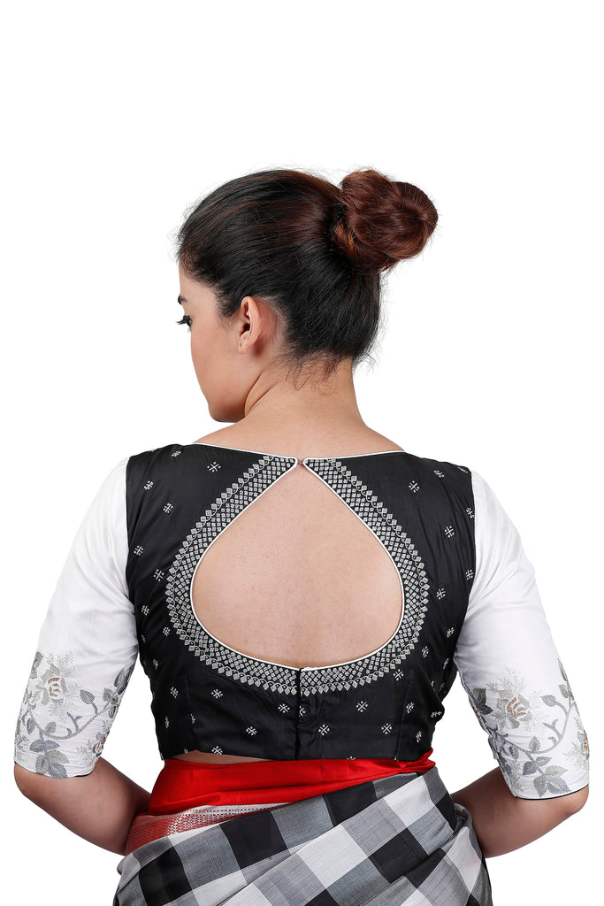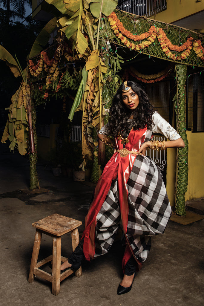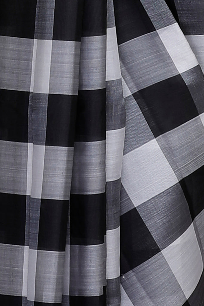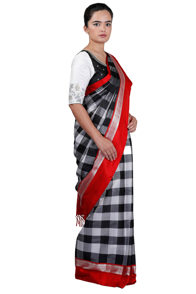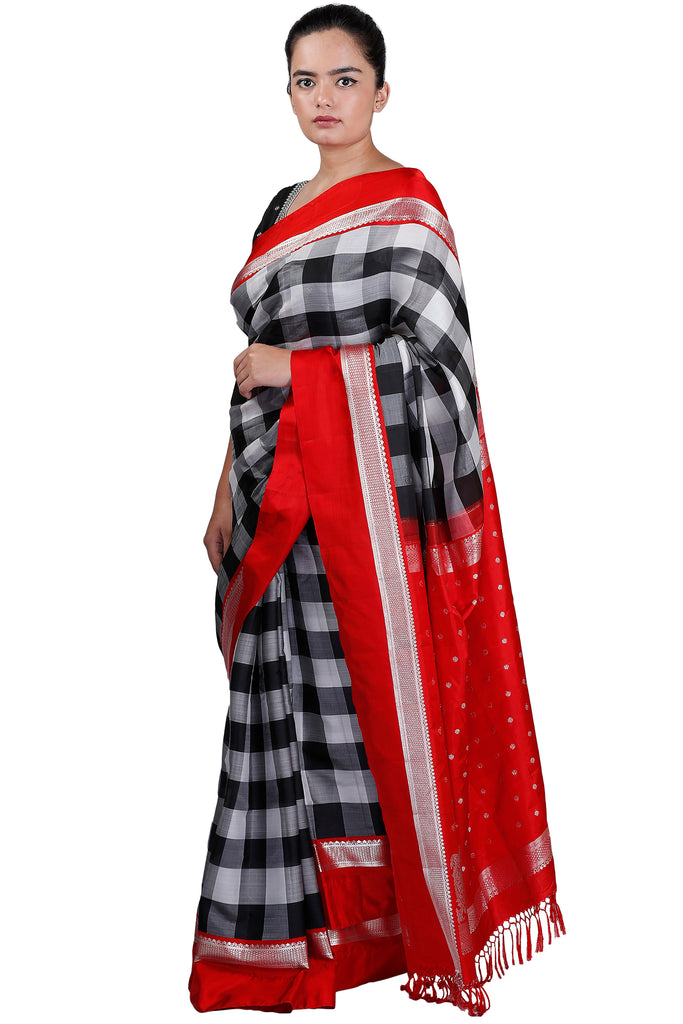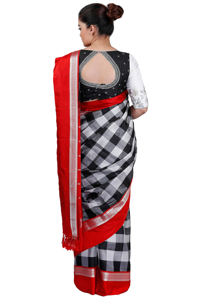 Drape yourself in style this winter with this gorgeous Kora silk saree in black and grey checks, with a stunning red silk border adorned with silver butta and mangoes and a pallu with a silver zari border. The saree is paired with a white silk blouse with black sleeves, detailed with hand-thread embroidery in silver and gold zari.