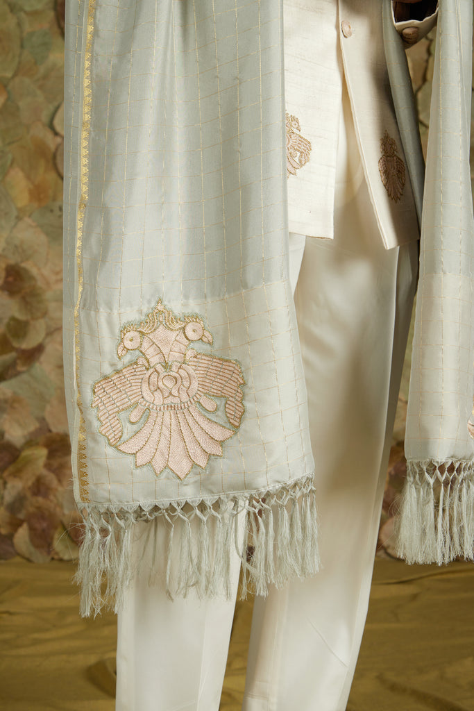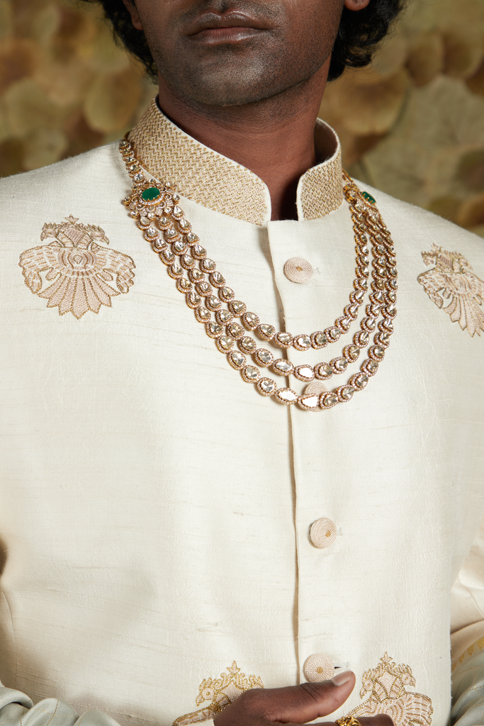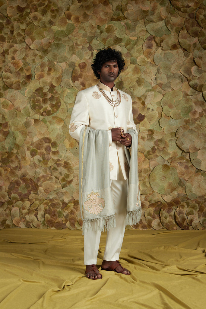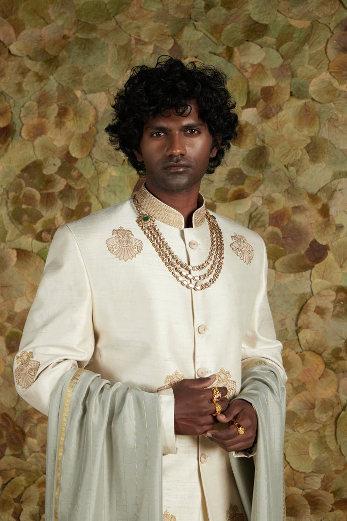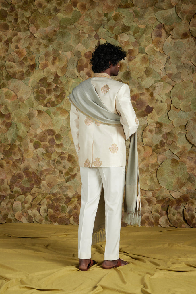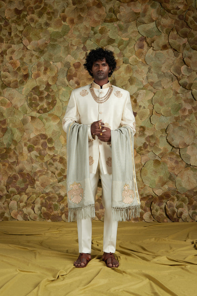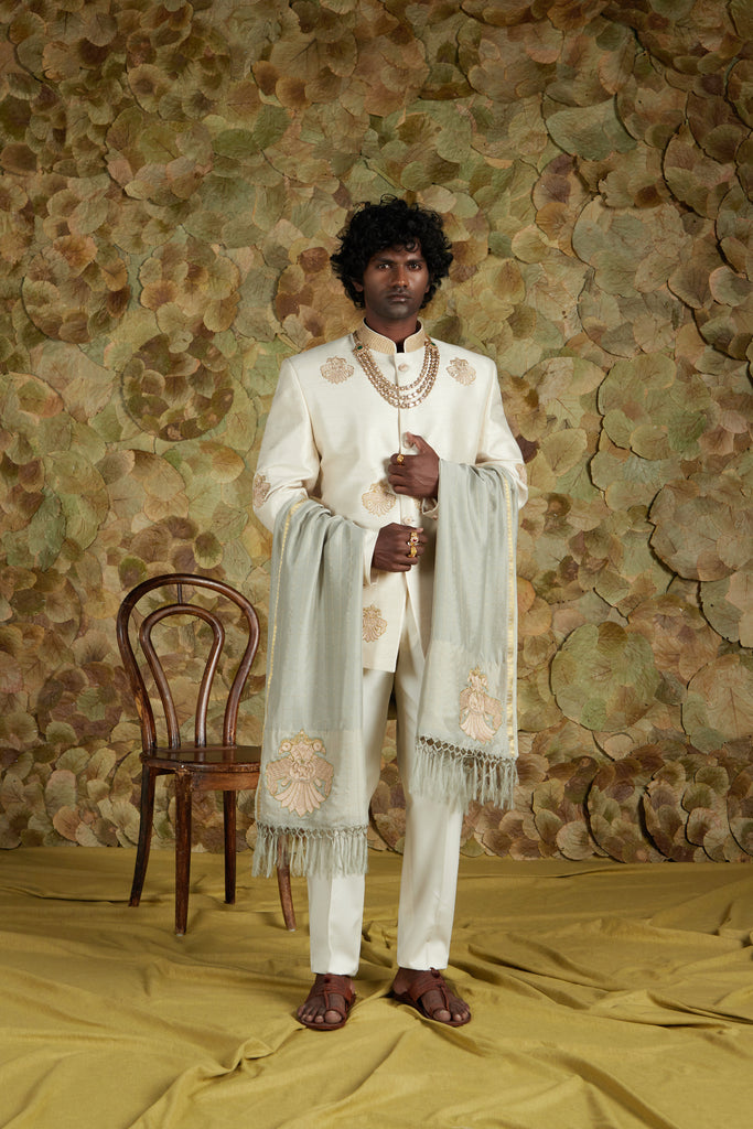 The Canoli Cream Bandhgala is the perfect selection for grooms seeking a polished, understated ensemble. The subdued hue of the fabric is elevated with intricate Aari gold zari beaten hand embroidery and Silk thread hand embroidery on Raw Silk, creating a grand yet serene appearance.