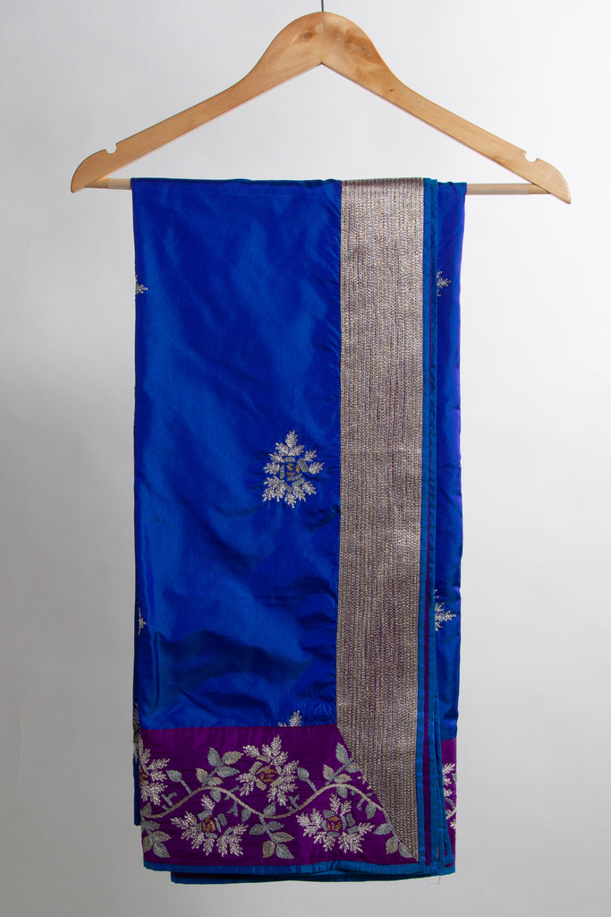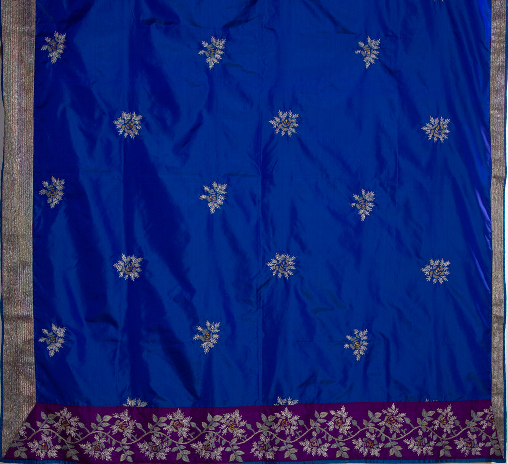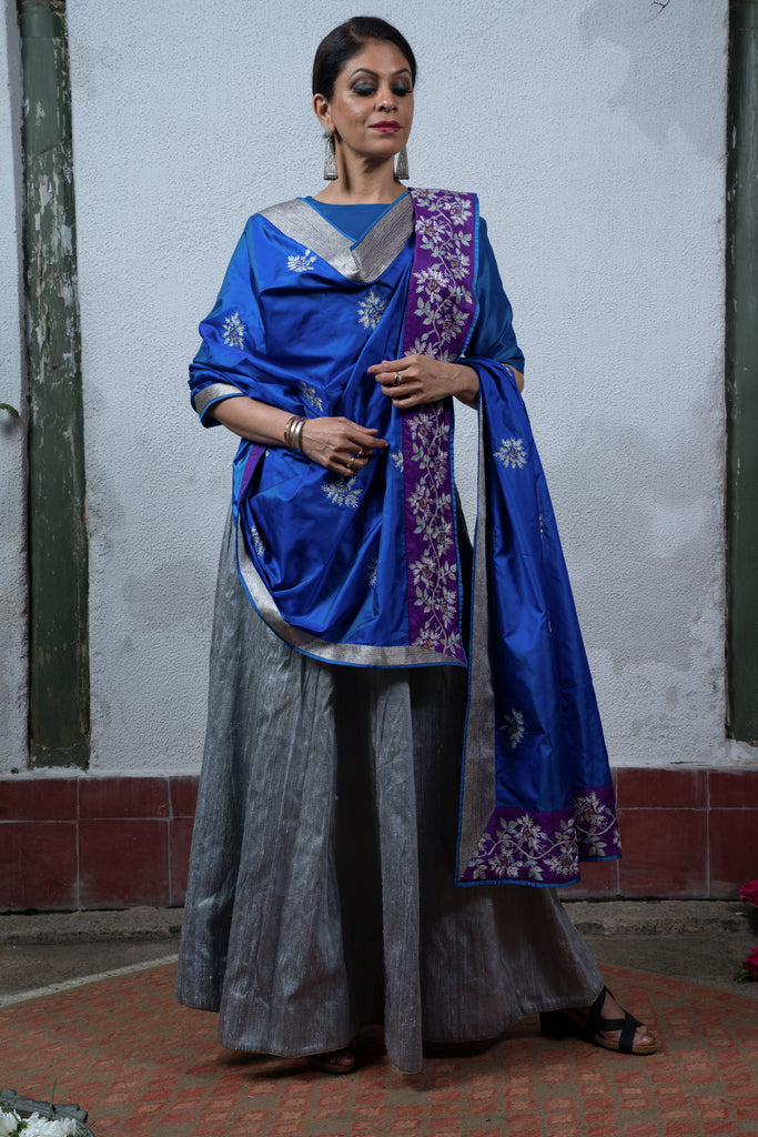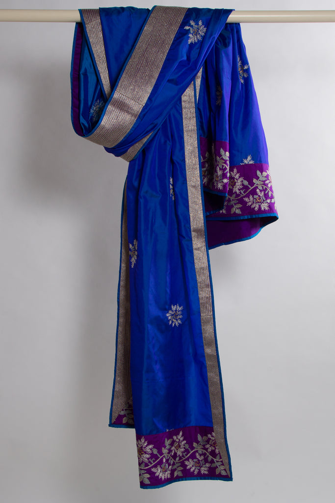 A striking vision in blue, this two-toned silk dupatta is the perfect canvas to celebrate the unique elegance of roses. It is detailed with rose buttas in beaten gold and silver thread work as well as hand embroidered rose creepers on both the pallus.