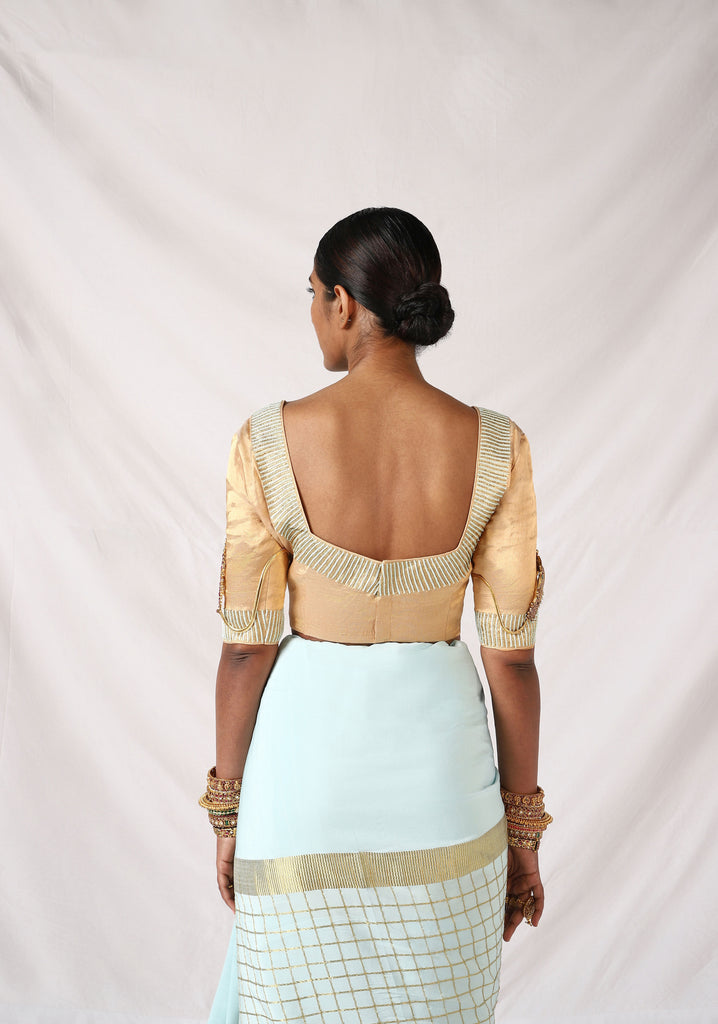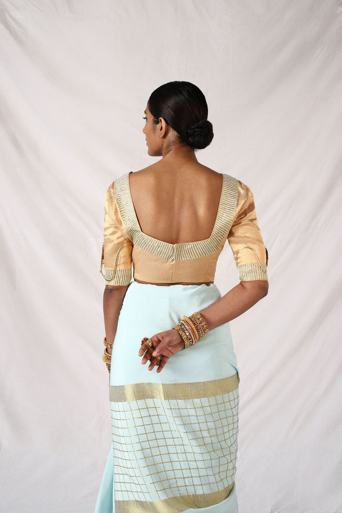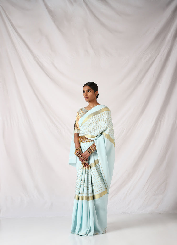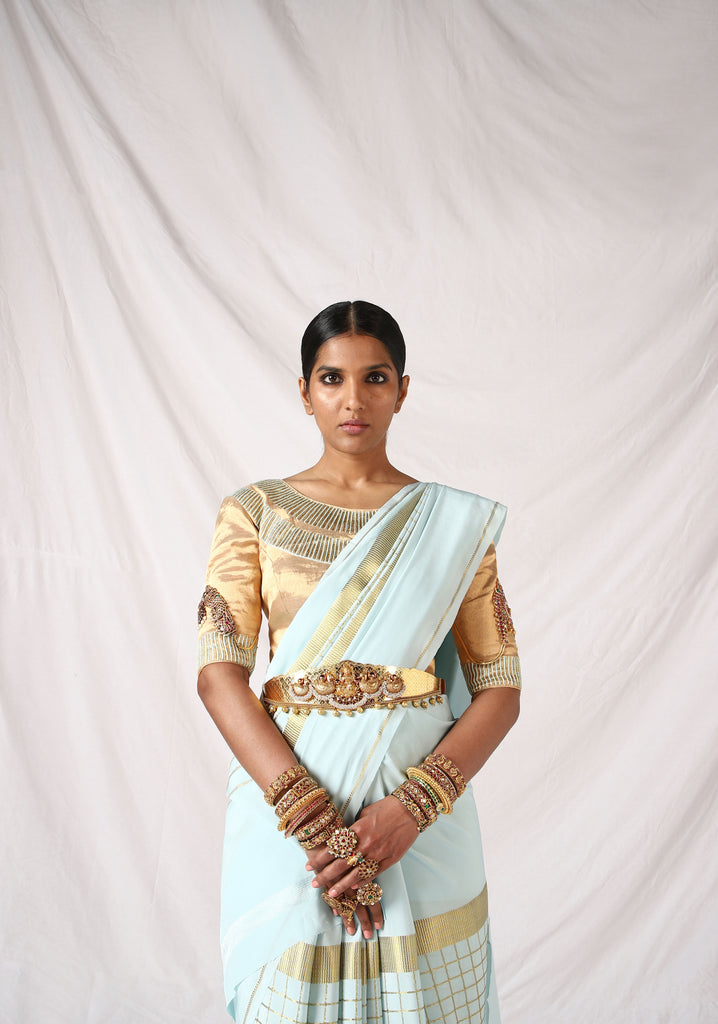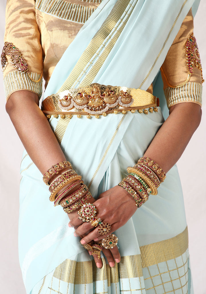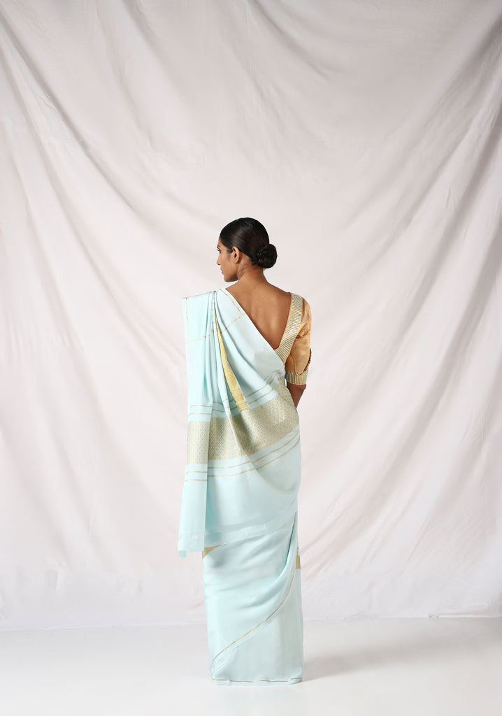 Opulent Eshwari saree in an alluring 'Canal Blue' or 'ಆಕಾಶ' shade, masterfully created by weaving threads of luxurious pure gold zari and beautiful Mysore crepe silk.