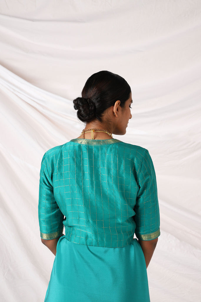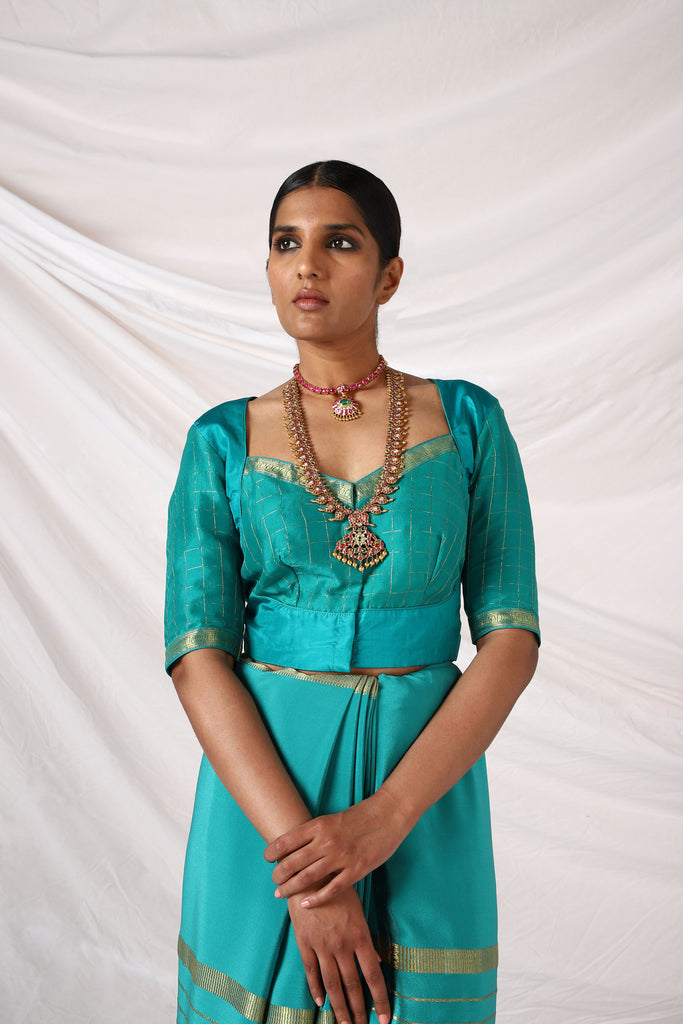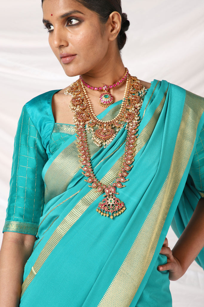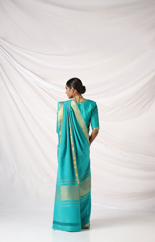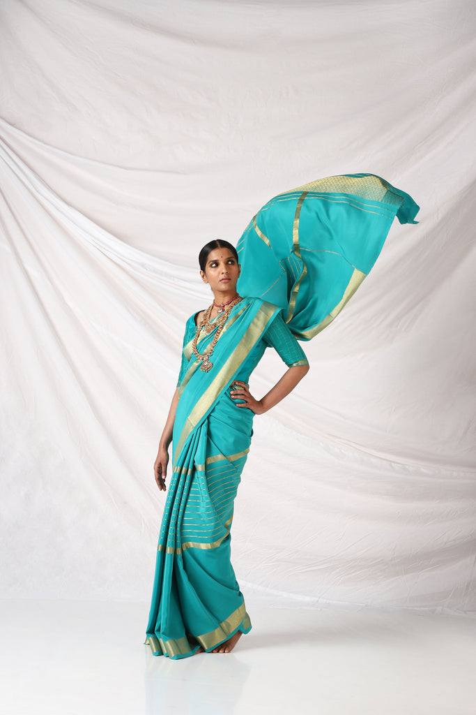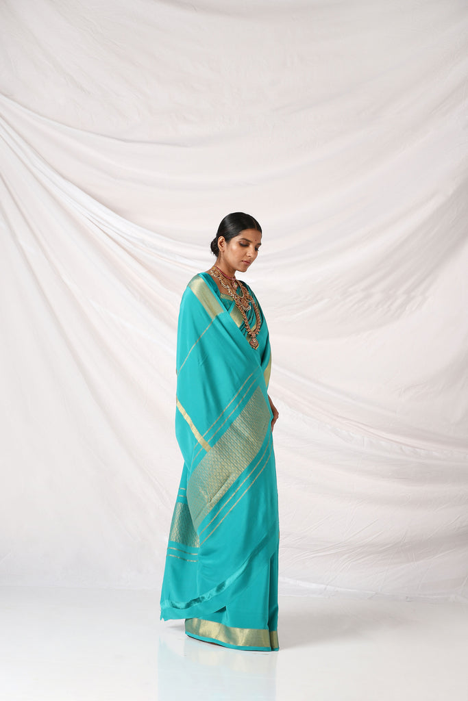 Exquisite Chandi saree in an enchanting 'Deep Peacock Blue' or 'ಆನಂದ' shade, meticulously crafted with intertwining strands of pristine pure gold zari and authentic Mysore crepe silk.