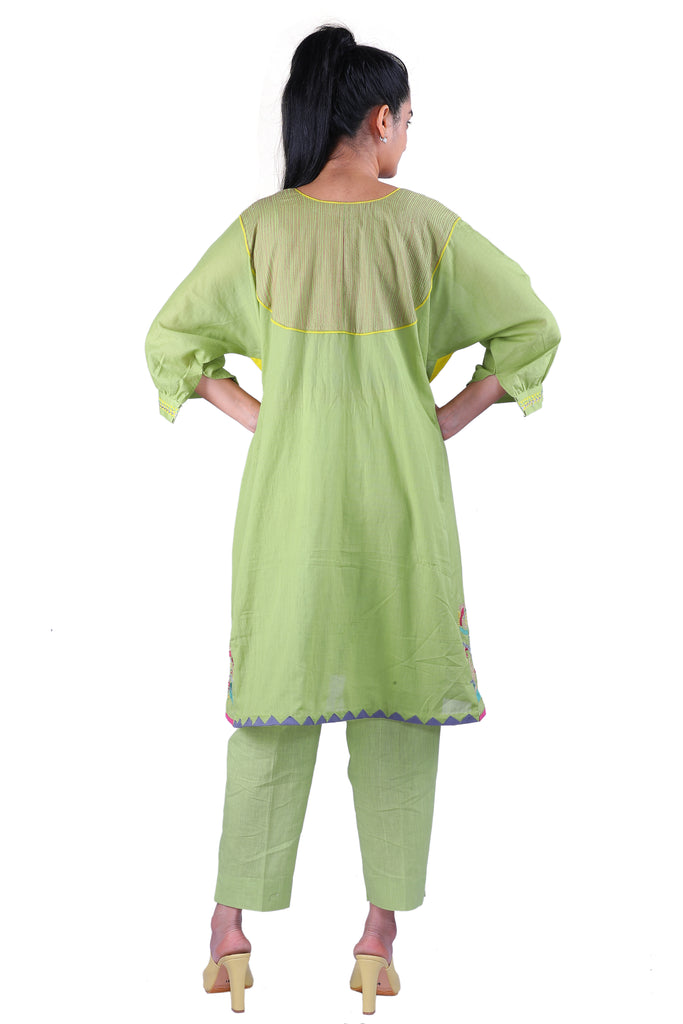 It's time to revamp your summer wardrobe! Get comfortable as the days heat up with this range of chic hand-woven Lemon green Chanderi kurta decorated with multi-colored hand embroidery and threadwork.