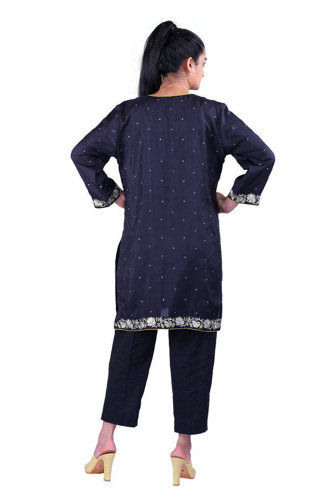 Summer style should be all about comfort and versatility, and that's exactly what this black soft silk kurta is! Detailed with beaten gold and silver hand embroidery, this blue top can be paired with a traditional chudidar and dupatta set, a casual pair of jeans, or even with formal pants.