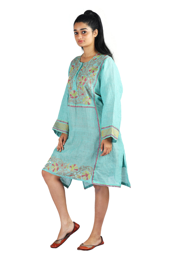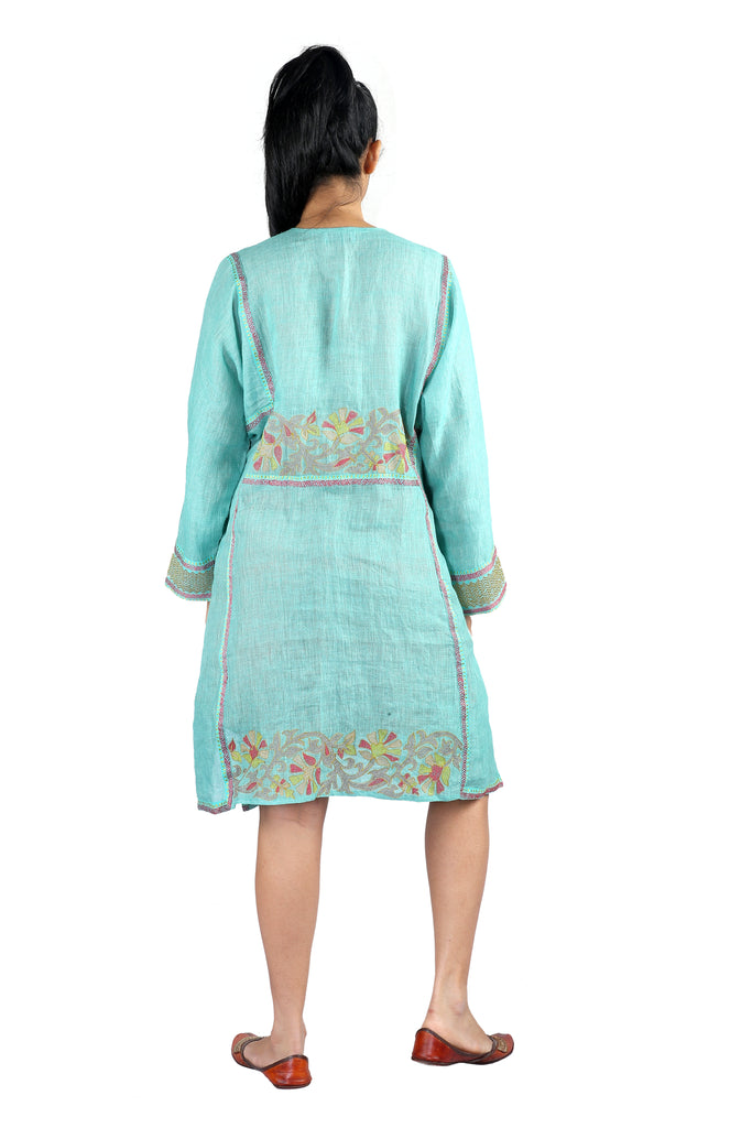 Flaunt your personality in this fun and flirty sleeveless tunic dress in light blue, crafted from organic hand-woven linen and adorned with intricate thread embroidery.