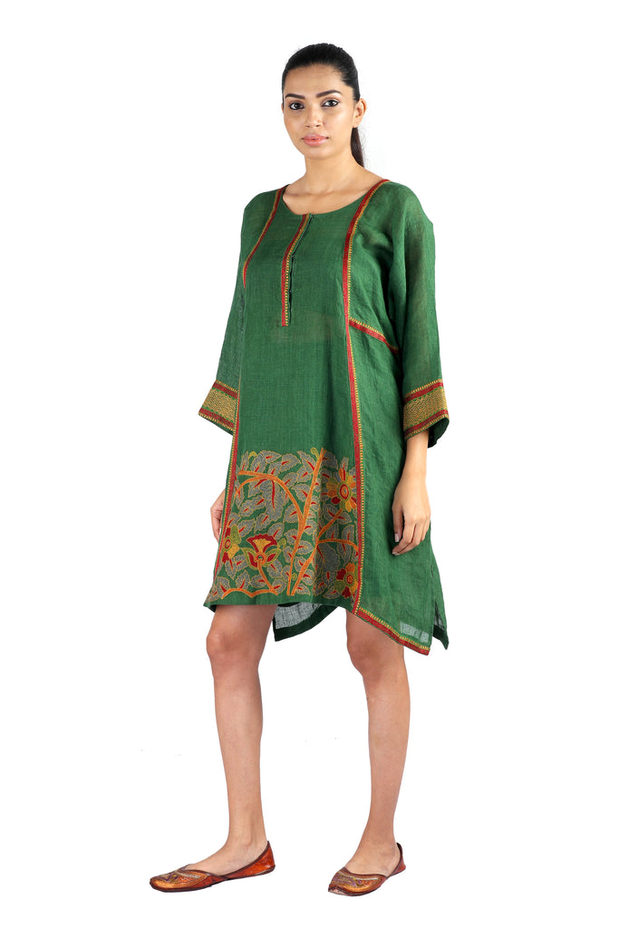 Channel your inner enchantress with this flowy tunic dress in dark green, crafted from the finest organic hand-woven linen and decorated with intricately detailed thread embroidery.