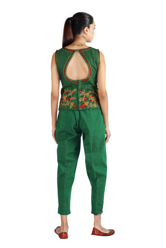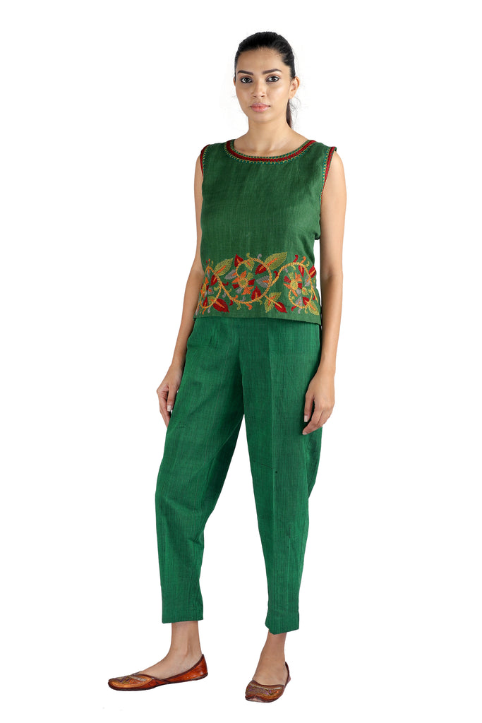 Who says fashion-forward and versatile don't go hand in hand? Flaunt this sleeveless green crop top – crafted from the finest organic hand-woven linen and adorned with thread embroidery – with any garment and make your style statement!