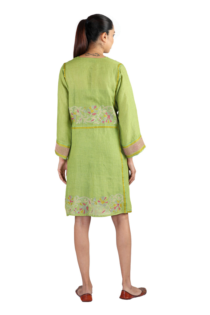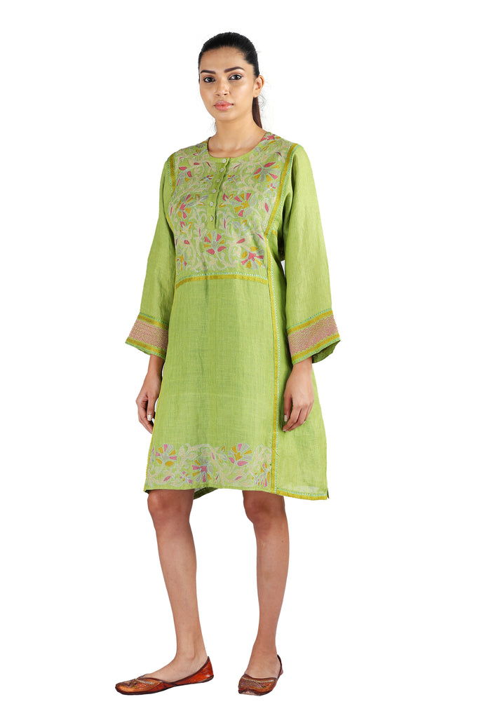 Dazzle the world in this stunning Lemon green tunic dress, made with organic hand-woven linen and finished with intricate thread embroidery.