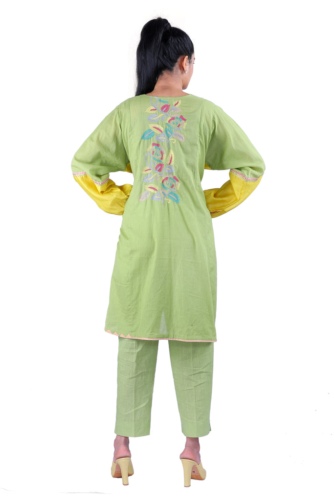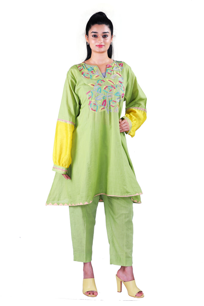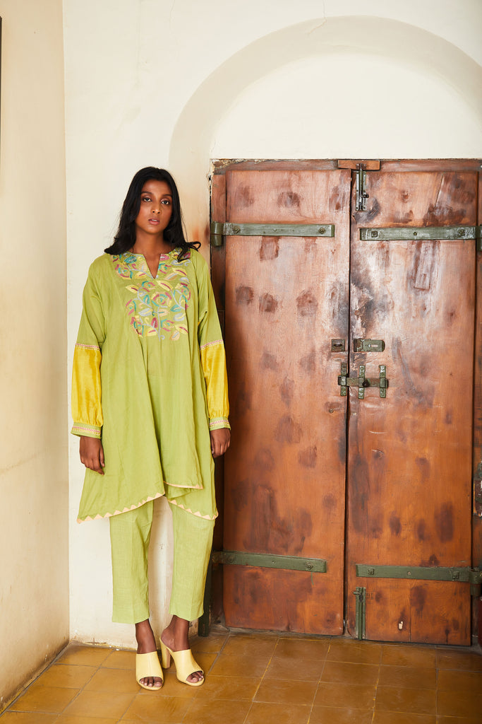 It's time to revamp your summer wardrobe! Get comfortable as the days heat up with this range of chic hand-woven Lemon green Chanderi kurta decorated with multi-colored hand embroidery and threadwork.
