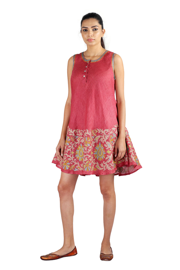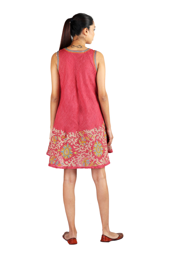 Make a bold style statement with this stunning hot pink tunic dress adorned with detailed thread embroidery, crafted from luxurious organic hand-woven linen.