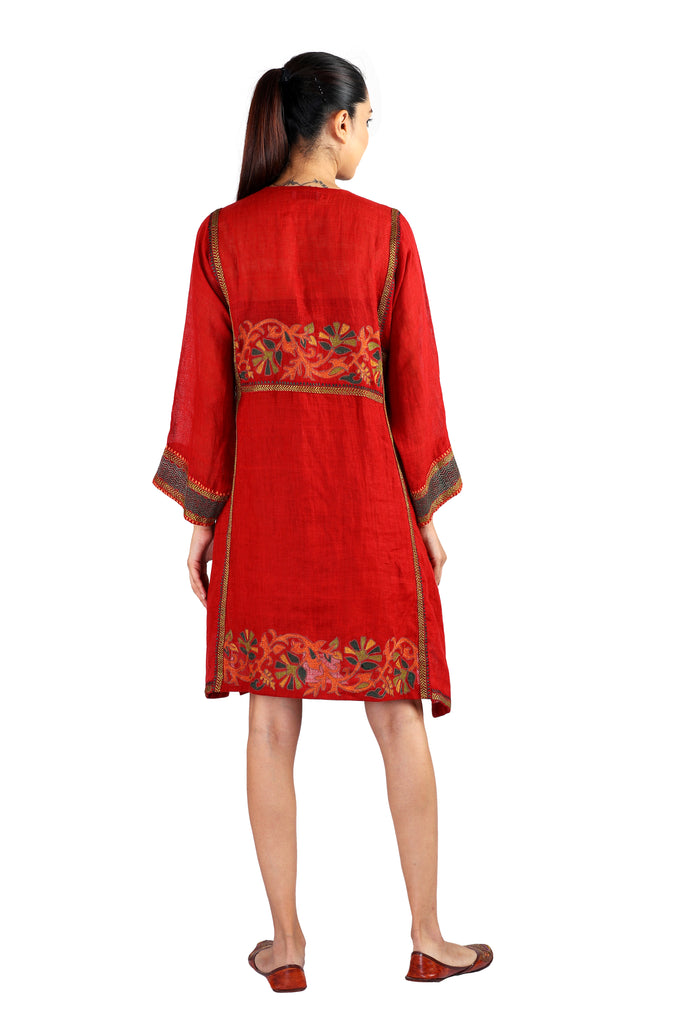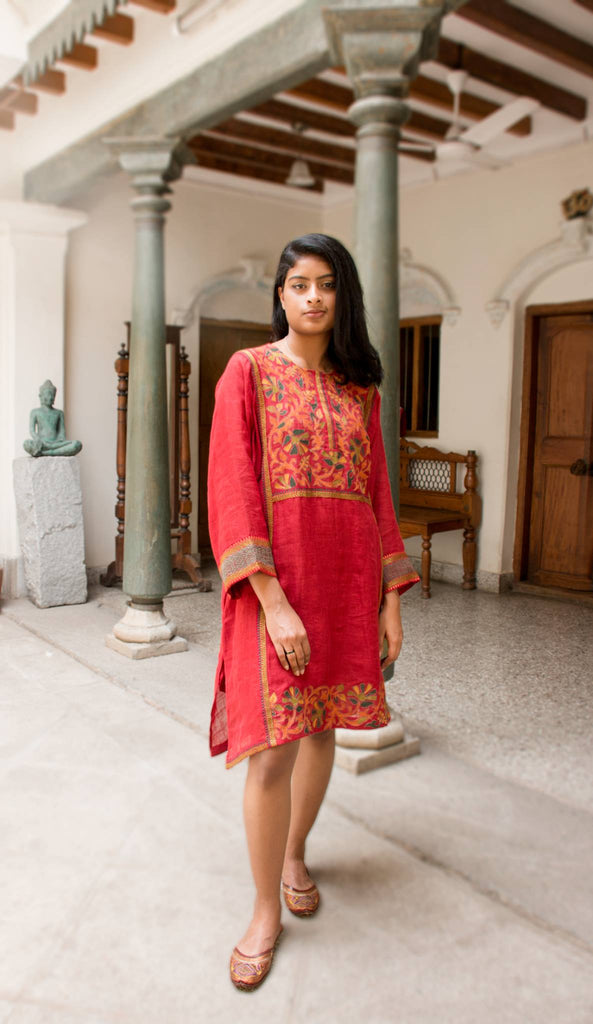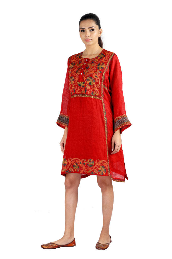 It's time to welcome summer in vogue with this warm and breezy tunic dress in red, designed with intricate thread embroidery over hand-woven organic linen.