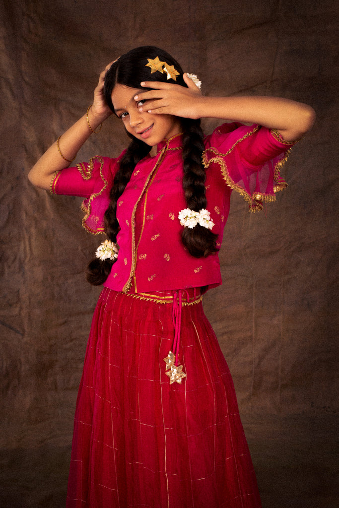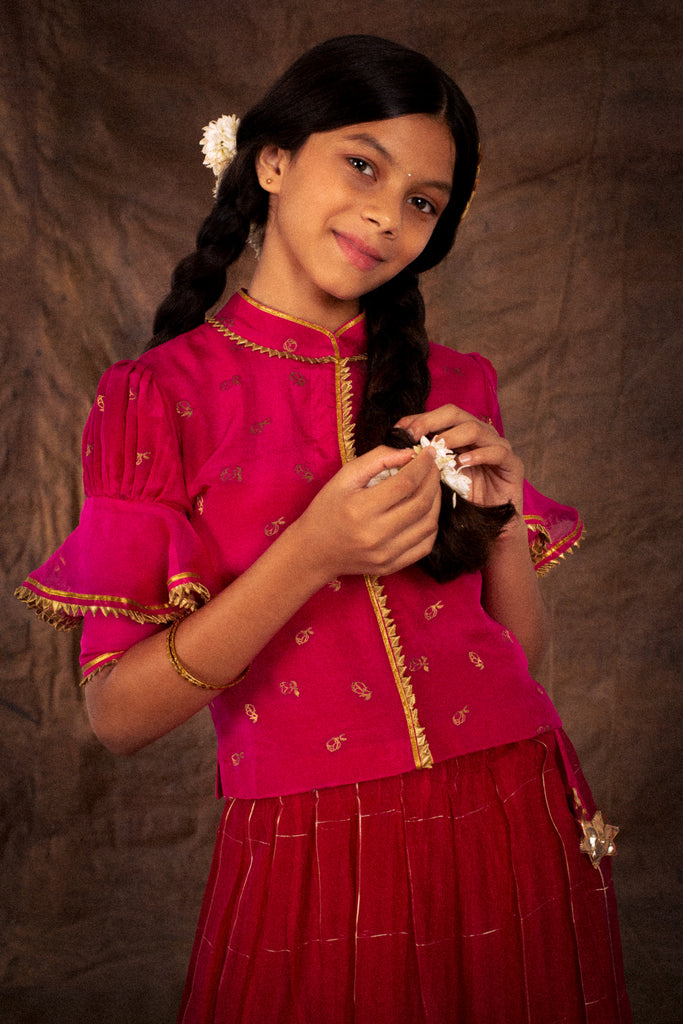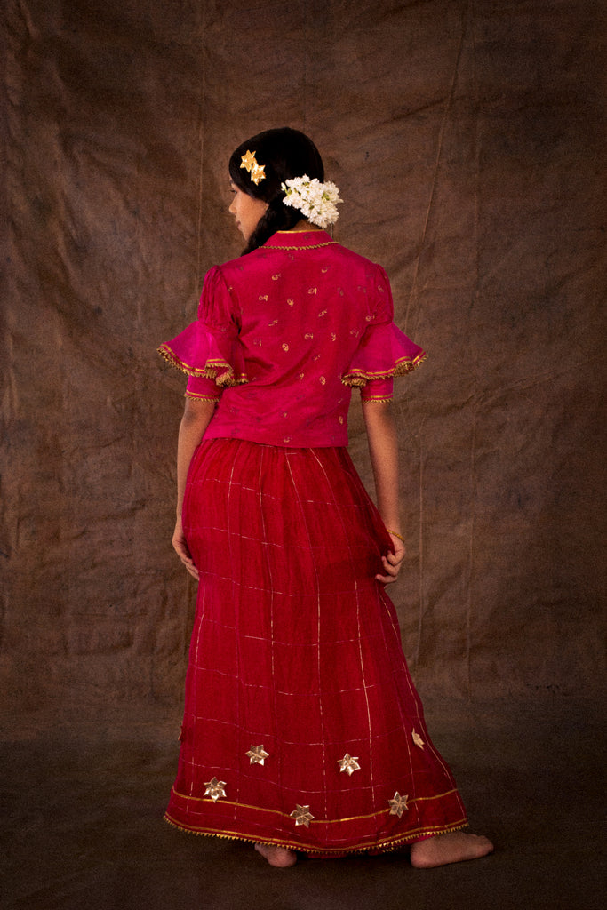 If you're all about the pop, this bright pink set with a soft silk top and an organza skirt is just the right choice.